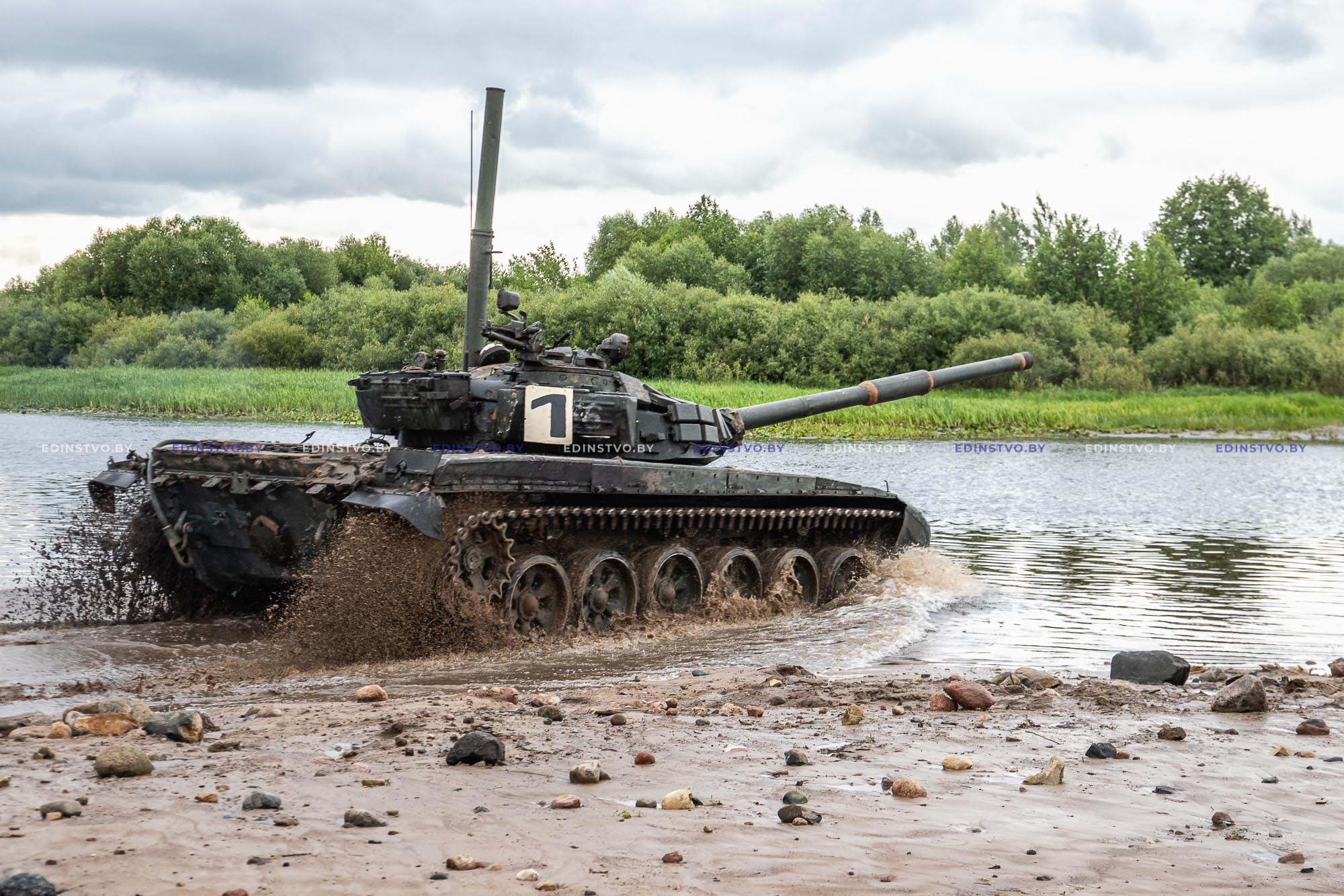 У старта – Т-72Б. Это основной танк, находящийся на вооружении белорусской армии. В экипаже 3 человека: механик-водитель, наводчик-оператор и командир танка. Сегодня занятие по преодолению водной преграды предстояло выполнить 24 механикам-водителям со штатными экипажами.