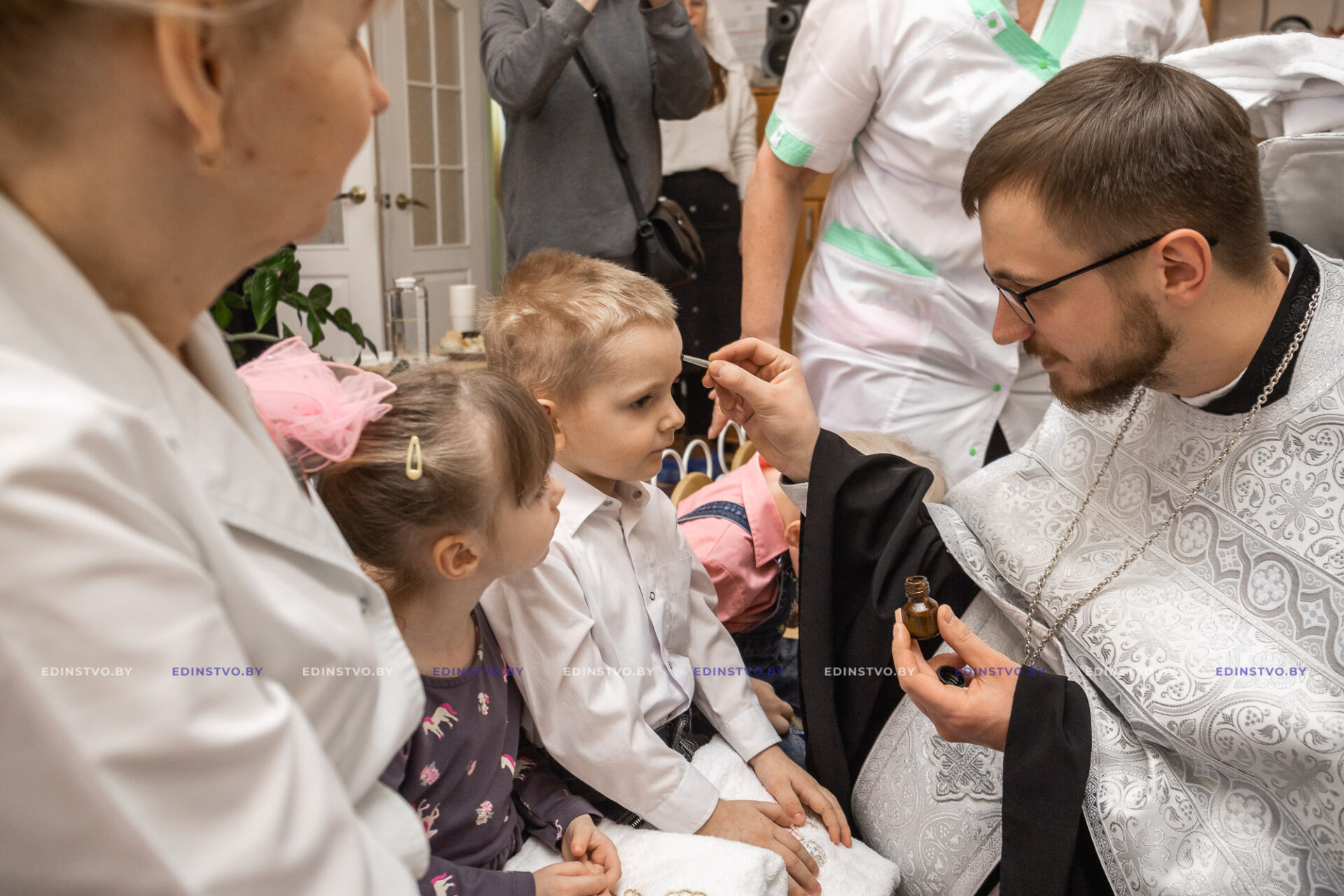 Удивительно, но во время таинства ни один ребенок не испугался чужих людей и не заплакал! Напротив, мальчики и девочки с большим интересом рассматривали гостей и, как могли — в силу своего возраста, общались со священнослужителями и сестрами милосердия из Елисаветинского женского монастыря г. Минска и сестричества в честь преподобной Евфросинии Полоцкой г. Борисова.