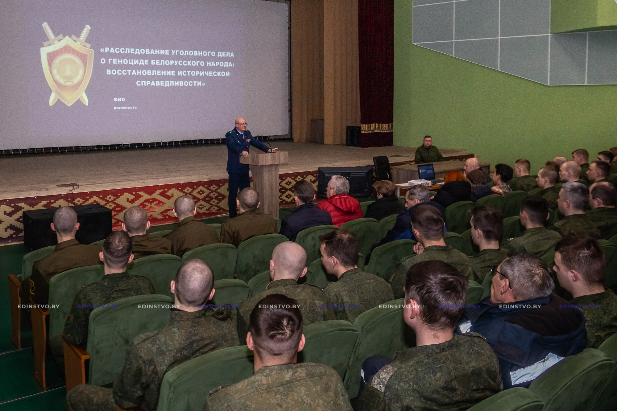 19 марта в 72 гвардейском объединенном учебном центре с военнослужащими встретился старший прокурор управления Генеральной прокуратуры по надзору за исполнением законодательства в войсках старший советник юстиции Александр Васильевич Корчак. Он поделился деталями расследования уголовного дела о геноциде белорусского народа.