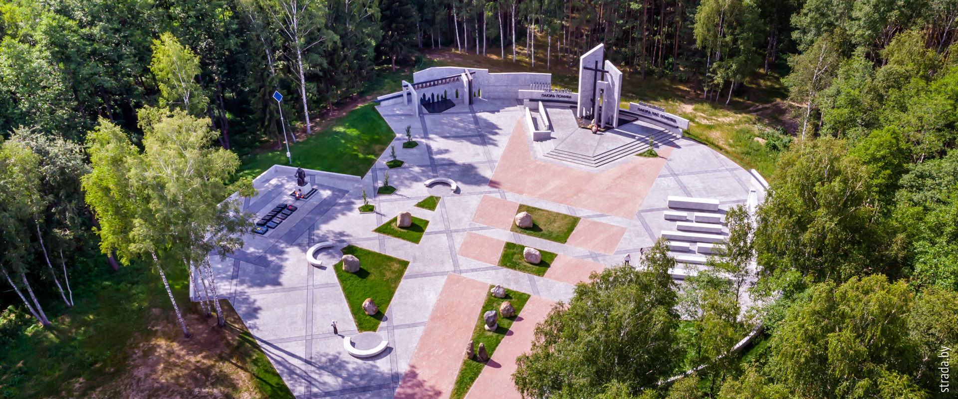 Центральное место занимает символичный крест и колокол. Рядом – звонница в виде стилизованного сарая с колоколами. Их количество соответствует числу деревень, жители которых здесь погибли.