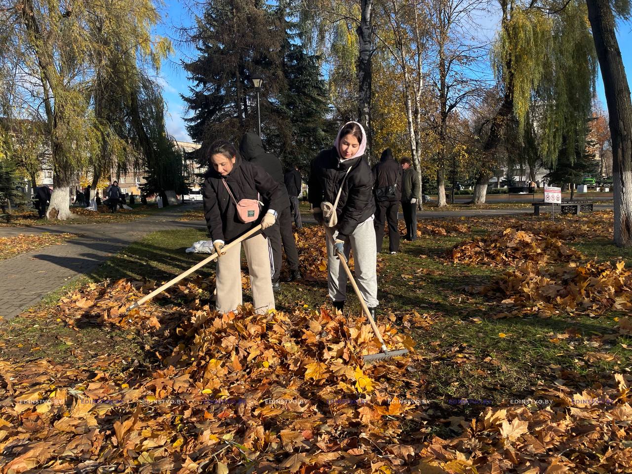 Работы было немало, но выполняли ее толокой и под звуки музыки. УП «Жилье» предоставило технику и инвентарь для наведения порядка. Ребята сгребали опавшую листву и складывали в мешки и пакеты. А мальчишки занимались ее погрузкой в специальную технику. Вместе с ними работали первый и второй секретари райкома союза молодежи Александр Осипенко и Елизавета Волковец.