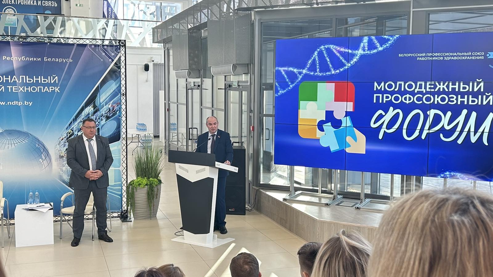 Министр здравоохранения Александр Ходжаев и лидер отраслевого профсоюза Вячеслав Шило открыли Молодежный профсоюзный форум работников здравоохранения. Также в форуме участвовал депутат Национального собрания Республики Беларусь VII созыва Андрей Савиных.
