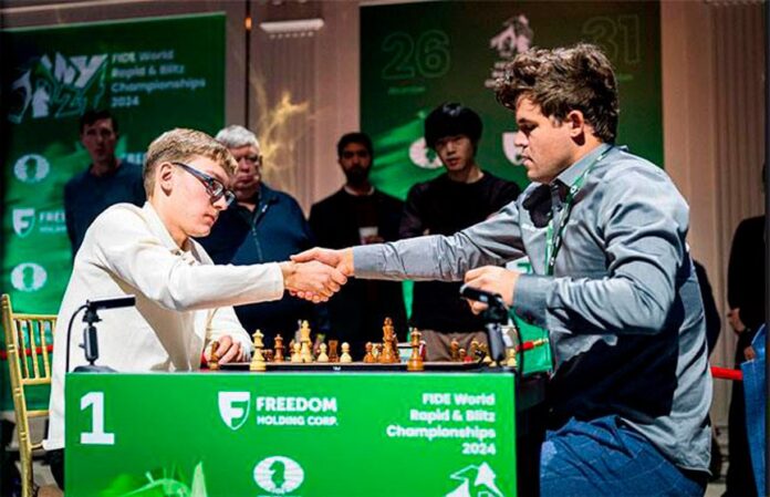 Выпускник средней школы №98 Заводского района Минска Денис Лазавик, играя белыми фигурами, одолел многократного чемпиона в пятом туре чемпионата мира по рапиду и блицу.