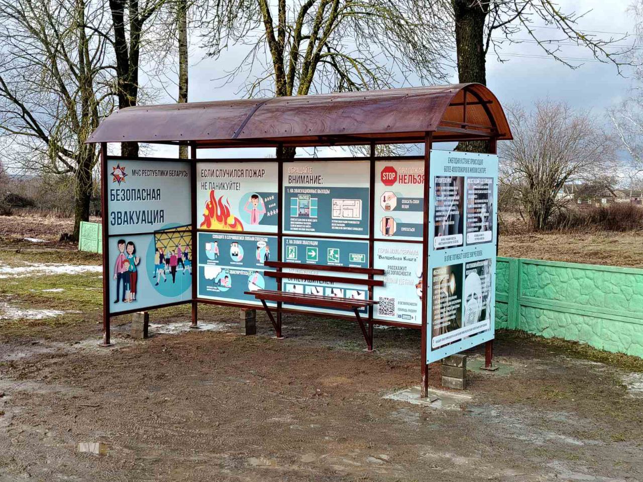 Новая остановка позволяет пассажирам, ожидающим автобус, укрыться от непогоды. На ее стенах размещены агитационно-пропагандистские материалы МЧС, напоминающее сельчанам о правилах пожарной безопасности.