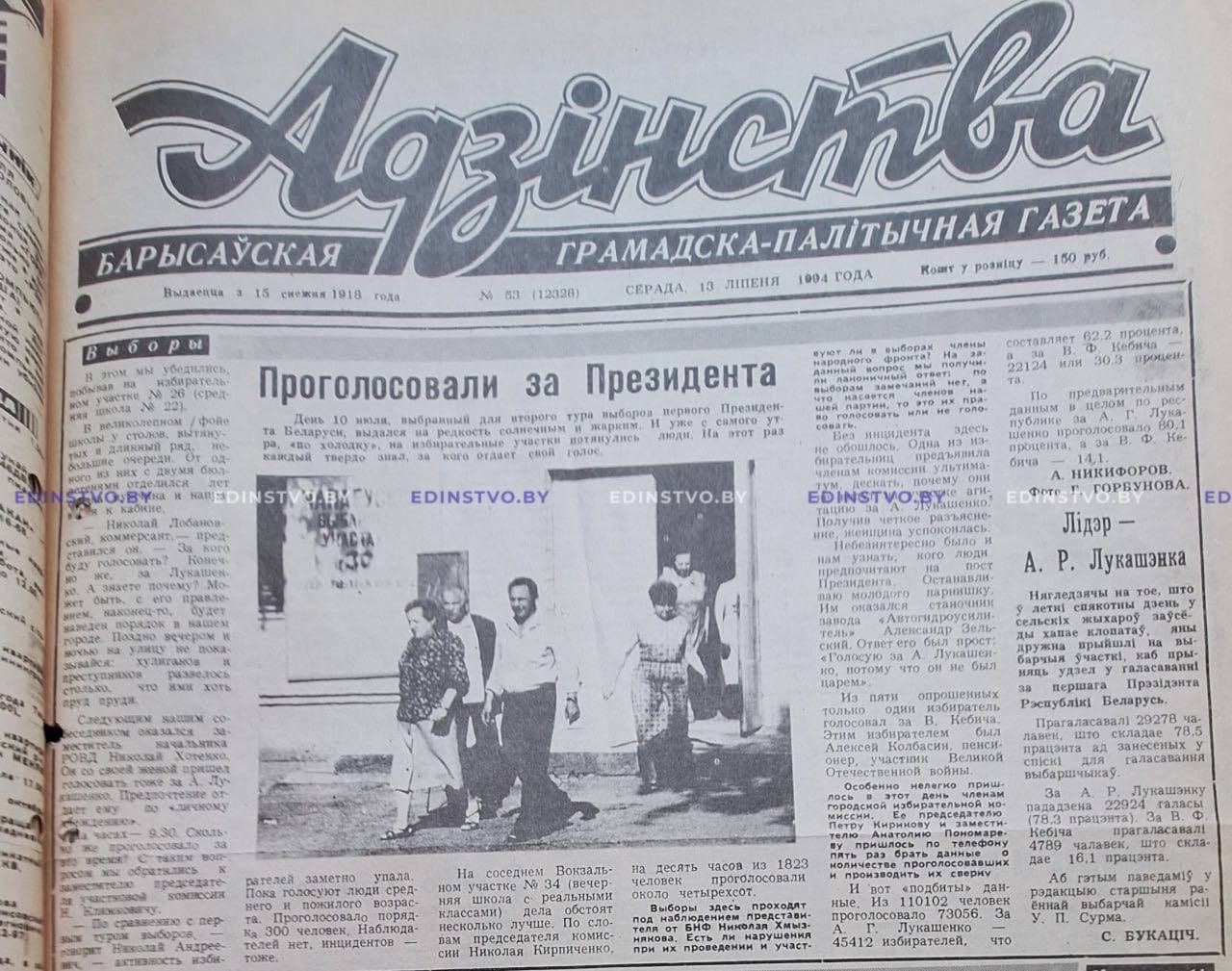 За А.Г. Лукашенко — 45412 избирателей, что составляет 62,2 процента, за В.Ф. Кебича — 22124, или 30,3 процента. По предварительным данным, в целом по республике за А.Г. Лукашенко проголосовало 80,1 процента, за В.Ф. Кебича — 14,1».