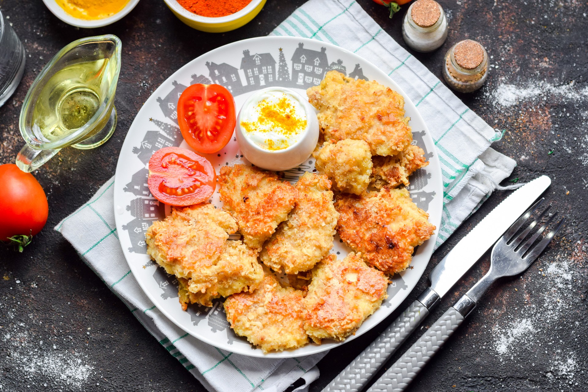 Аппетитные куриные наггетсы в картофельной шубке. Для «шубки» яичные белки взбиваются в пену, а затем смешиваются с натёртым картофелем и специями. Куриное мясо получается мягким и сочным, а картофельная шубка — хрустящая снаружи и нежная внутри.
