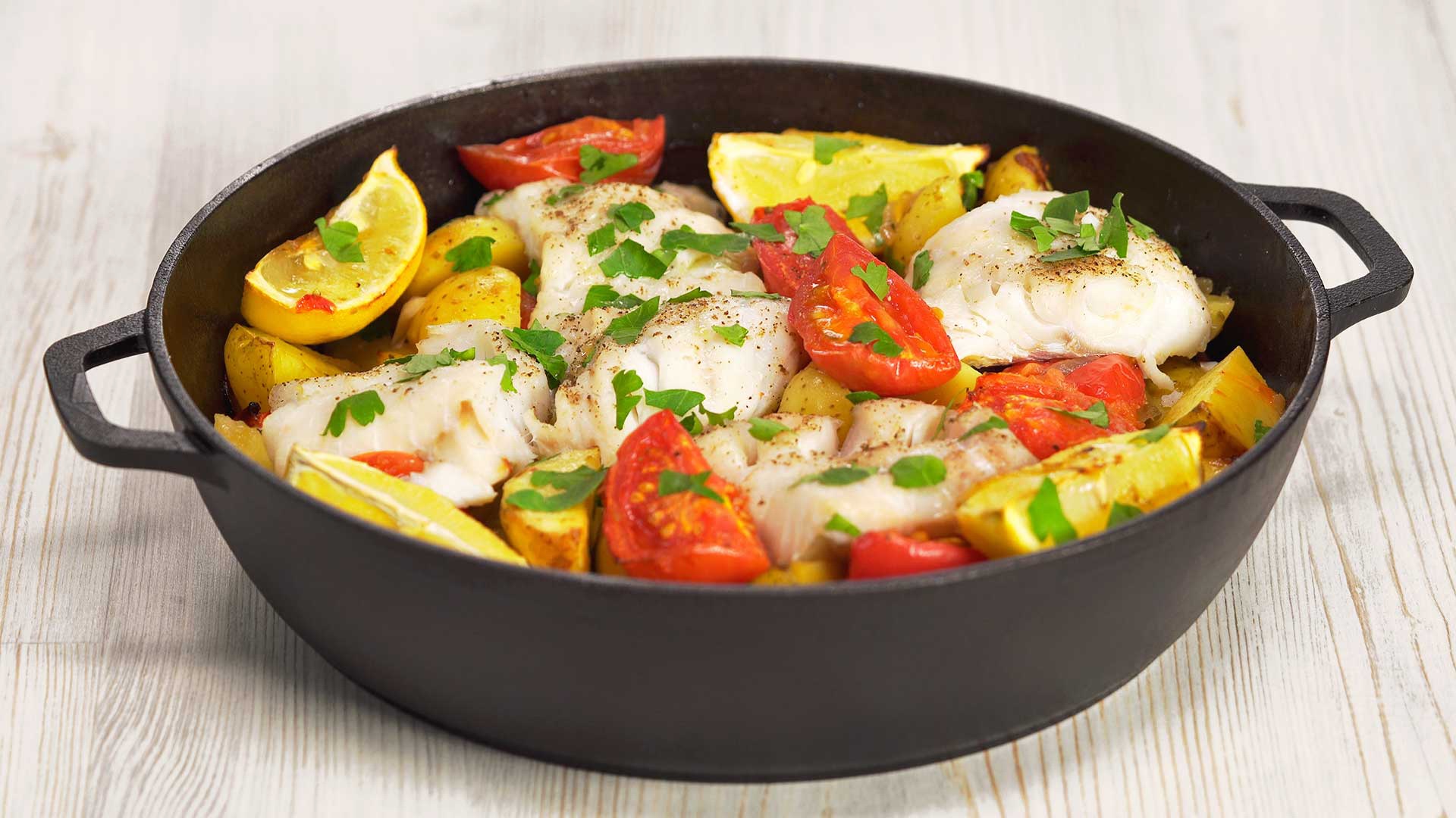 Это превосходное блюдо из филе белой рыбы, картофеля и помидоров, запекается в духовке. Вам не понадобится предварительной подготовки, много усилий или специального умения, чтобы приготовить запеченную рыбу. Перед подачей посыпьте готовое блюдо зеленью свежей петрушки и здоровый обед или ужин доставит вам настоящее удовольствие.
