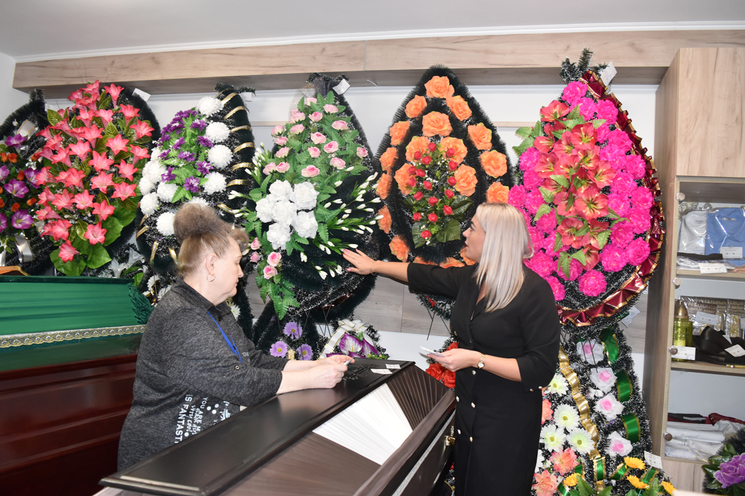 — У нас есть все, что необходимо для погребения, и по доступным ценам: гробы различного размера, расцветки и фактуры, венки и корзины из искусственных цветов, православные и католические кресты, одежда, обувь, пакеты для тел усопших и многое другое, — рассказала продавец Светлана Мирук. — За год, что прошел с открытия, магазин уже знают в городе. Пользуются спросом и наши товары, и ритуальный зал, в котором одновременно могут находиться до сорока человек. В прошлом году он был заказан 54 раза. Если говорить по ценам, то самый бюджетный гроб стоит 111 руб., венки — от 52 руб., корзины — от 39 руб. Невысокая стоимость связана с тем, что мы производим данную продукцию сами. Цены на сопутствующие товары тоже невысокие. Аренда ритуального зала — 60 руб. за час. В общей сложности, если брать по минимуму, организация похорон без поминального стола обойдется в 600-650 рублей (у нас же еще плюс услуги морга: помыть, одеть и т.д.). Но все зависит от желания клиента. Также предприятием предоставляются документы, которые подтверждают оплату товаров, услуг, для получения компенсационных и страховых выплат. Возможен любой удобный для покупателя способ оплаты (наличный и безналичный расчет).