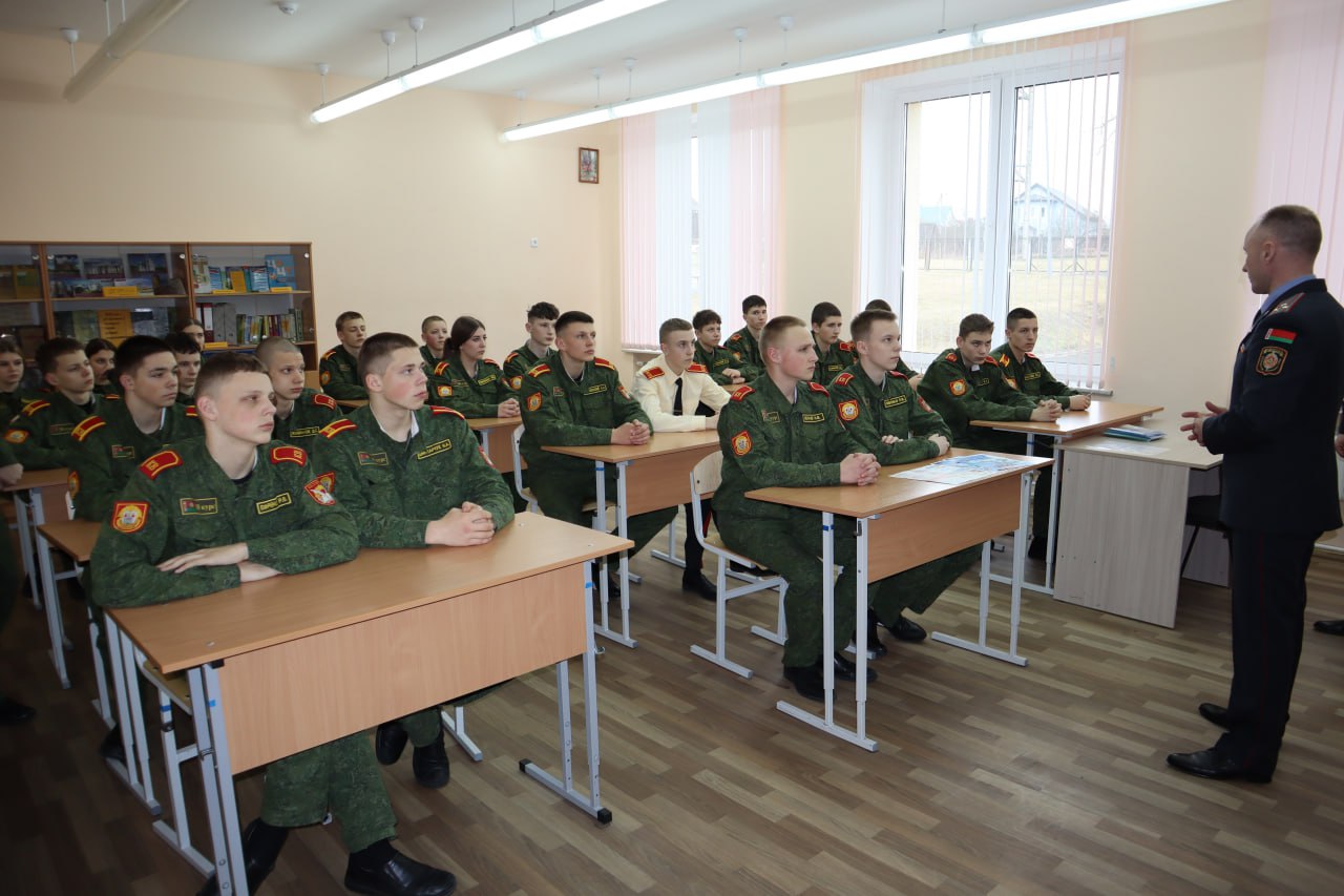 В рамках профориентационных мероприятий в Борисовском кадетском училище прошла встреча с заместителем начальника райуправления по идеологической работе и кадровому обеспечению полковником милиции Виталием Белоцким и курсантом 4 курса учреждения образования «Академия МВД Республики Беларусь» Егором Тарасовым.