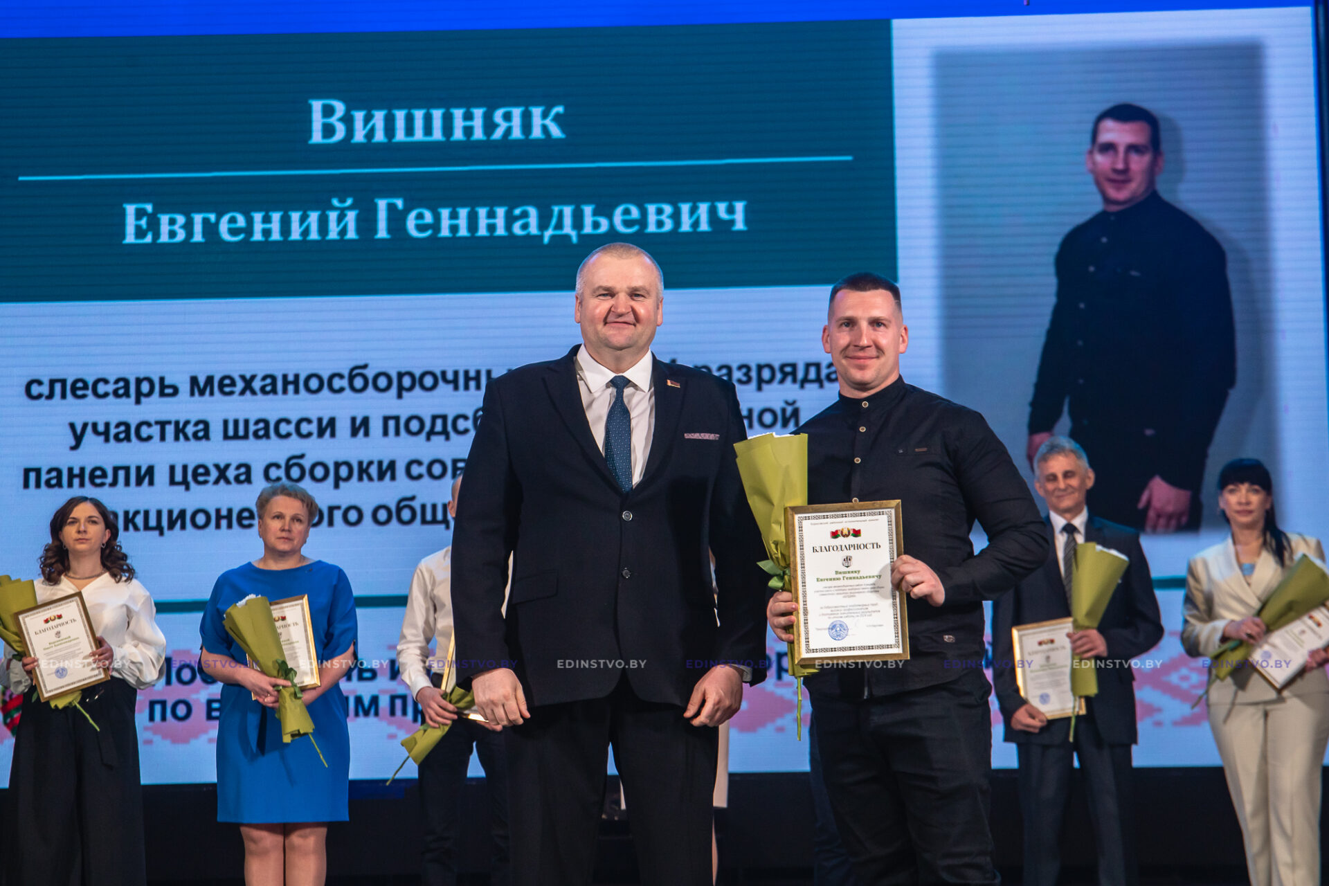 За многолетний добросовестный труд в автомобильной отрасли, высокий профессионализм, примерное исполнение профессиональных обязанностей и в связи с подведением итогов работы за 2024 год он вручил Почетную грамоту председателя Миноблисполкома Дмитрию Островскому (маляру цеха окраски мелких деталей «БЕЛДЖИ), благодарности председателя облисполкома — Елене Гордеевой (заместителю главного врача Борисовского роддома), Елене Горецкой (директору СШ №2); Людмиле Полещук (оператору животноводческого комплекса «АФТАБ»), Александру Старовойтову (каменщику «Борисовжилстрой»), Олегу Величко (трактористу-машинисту филиала «Большие Новоселки»).