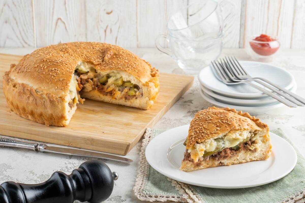 По сочетанию продуктов этот пирог очень напоминает чизбургер. Начинка получается очень сочной, а тесто мягкое и пушистое.