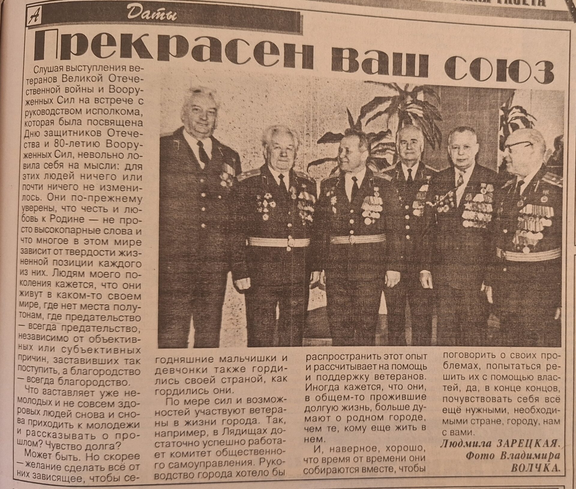 1998-й был юбилейный год для Вооруженных Сил, которым исполнялось 80 лет, и забегая вперед, — юбилейный для «Адзінства», которому тогда исполнилось столько же. Вспоминая события Великой Отечественной войны, хочется привести и такой факт: «Большевистская трибуна», так тогда называлась газета, выходила подпольно на оккупированной территории в виде листовки. «Освещала события на фронте, операции партизан и их боевую подготовку. Редактором был Д.Копытков» (статья «Летописец родного края», 20 октября 1998г.).