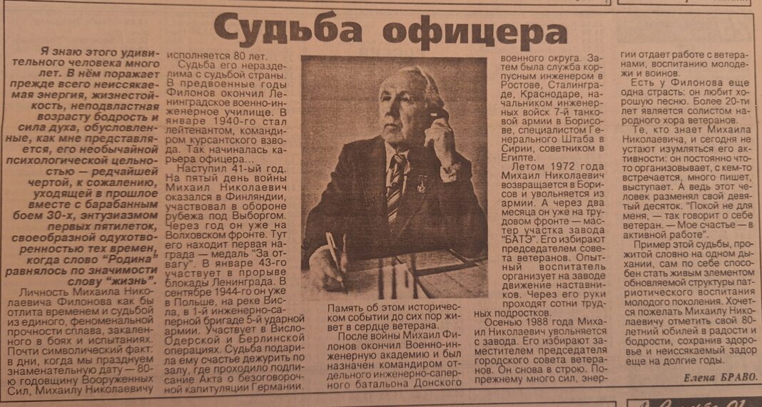 Свой восьмидесятилетний юбилей отмечал в тот год Михаил Филонов. «В январе 1940-го молодой лейтенант был назначен командиром курсантского взвода. На пятый день войны Михаил Николаевич оказался в Финляндии, участвовал в обороне рубежа под Выборгом. Через год он уже на Волховском фронте. Тут его находит первая награда — медаль «За отвагу». В январе 43-го