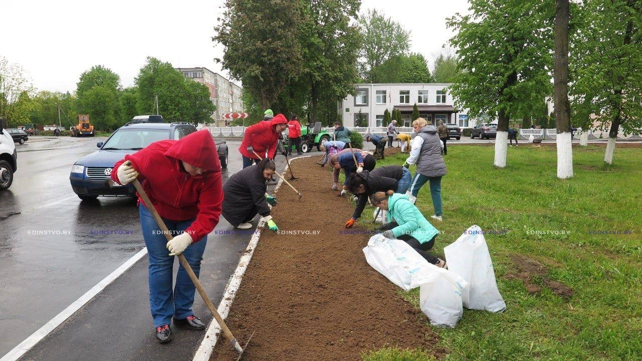 Пасмурная погода не испугала участников субботника, они с энтузиазмом взялись за дело. На подготовке клумбы к посадке цветов с лопатами в руках сообща трудились член Совета Республики Национального собрания Республики Беларусь Тамара Красовская и депутат нижней палаты парламента Александр Шипуло.