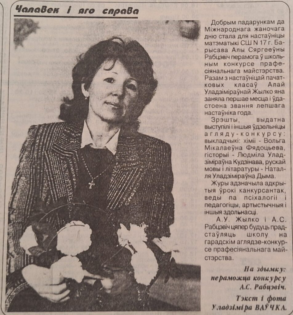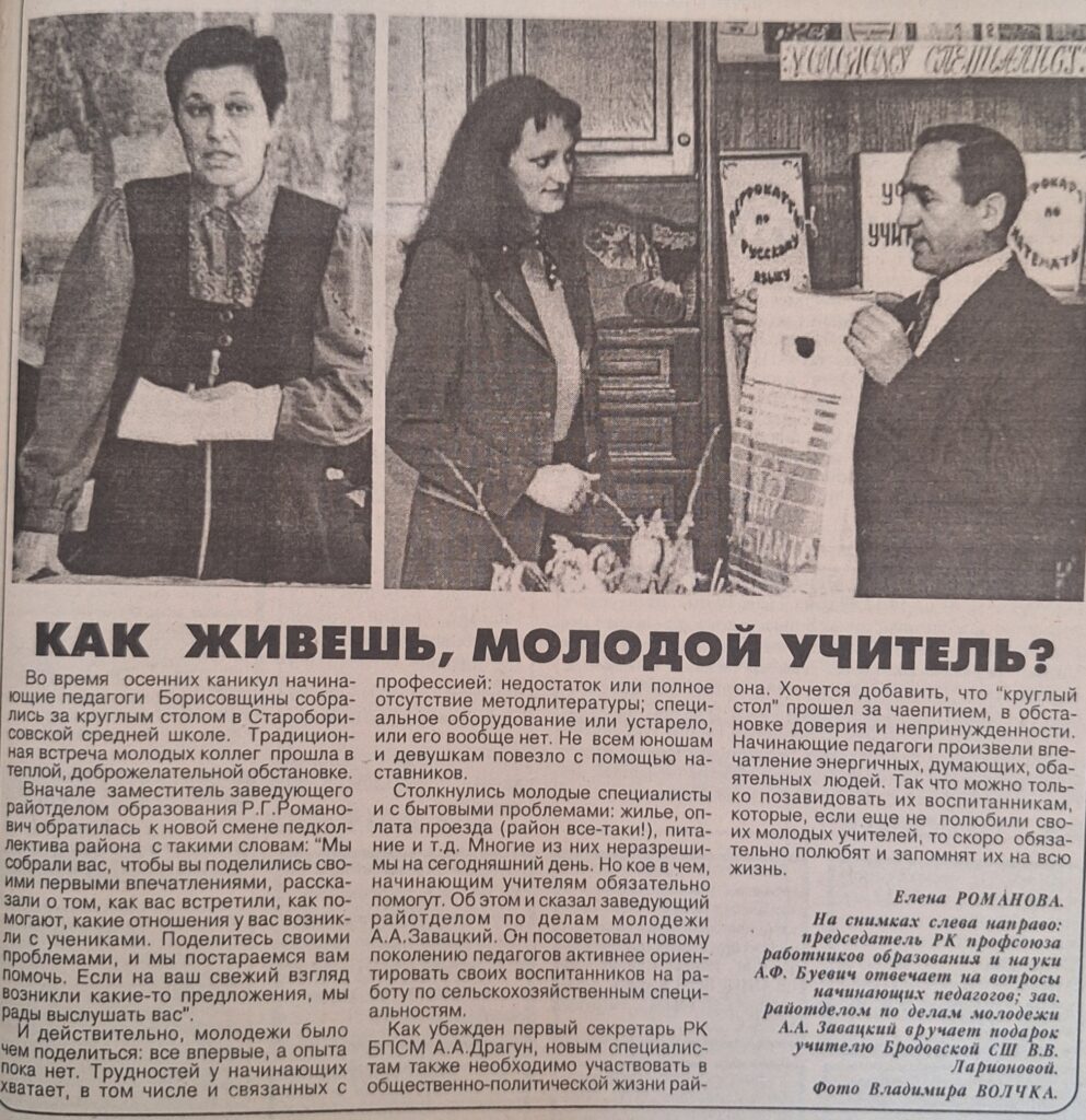 В номере от 26 февраля рассказывается о том, что на заседании клуба творчески работающих учителей «Педагог» чествовали коллективы СШ №16 (директор С.Ф. Прохоренко), СШ №15 (директор А.Д. Фурсов) СШ №20 (директор О.Ю. Сотник), гимназии №1 (директор Л.Э. Бачило) и другие, чьи воспитанники показывали отличные успехи в учебе и спорте. В этой же статье, которая называется «Ими гордится город», указывается: «Отдел образования Борисовского горисполкома поздравляет Е.Е.Волынца, учителя физики гимназии №1, Н.И. Гайдук, учителя географии из второй гимназии, Н.С. Сыроежкину, учителя географии школы №17, которые внесли личный вклад в развитие способностей одаренной молодежи. Им назначены премии с вручением свидетельства специального фонда Президента РБ А.Г. Лукашенко». К слову, в районе трудилось 13 отличников образования Беларуси, 107 учителей высшей категории.
