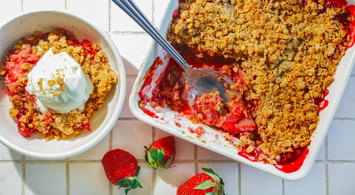 - Выпекайте клубничный крамбл в разогретой духовке при температуре 180 градусов примерно 25 минут.