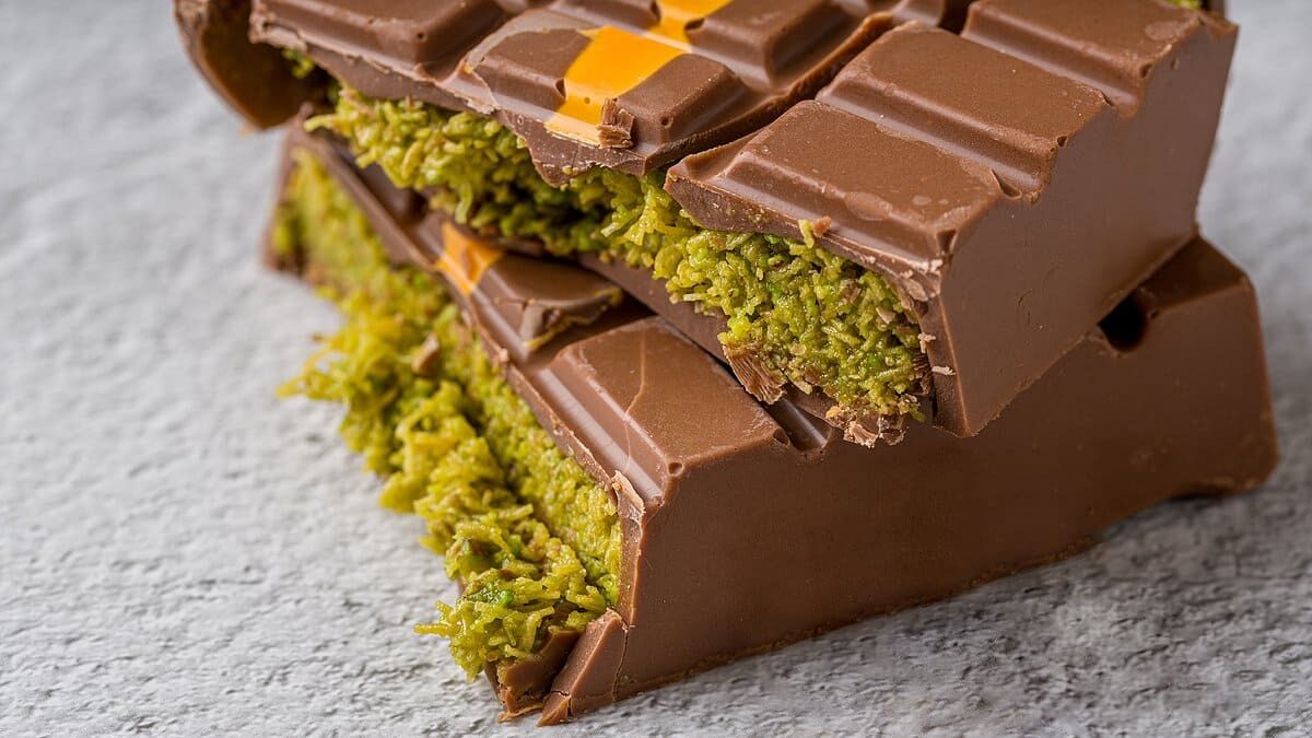 Это тот самый шоколад, который завирусился в соцсетях. Сделать сладость можно из обычного шоколада, теста катаифи и фисташковой пасты.