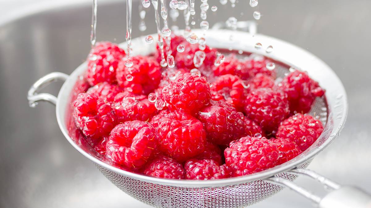 - Опустите дуршлаг с малиной в миску с водой. Убедитесь, что ягоды полностью погружены в воду.