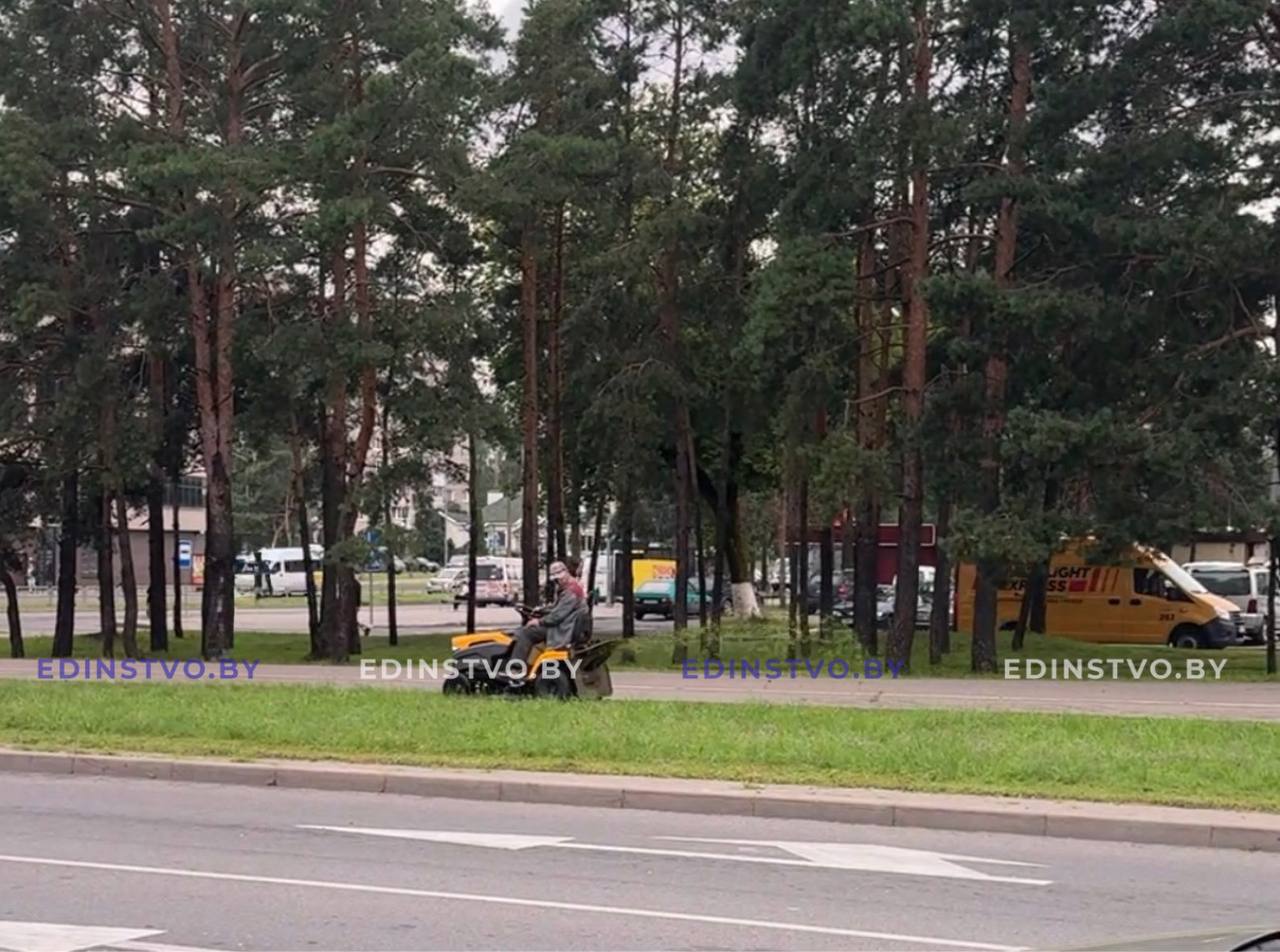 Кроме того, на зеленой зоне главной автомагистрали Борисова сейчас косят траву и газон тракторная косилка и райдер (мини-тракторная газонокосилка).