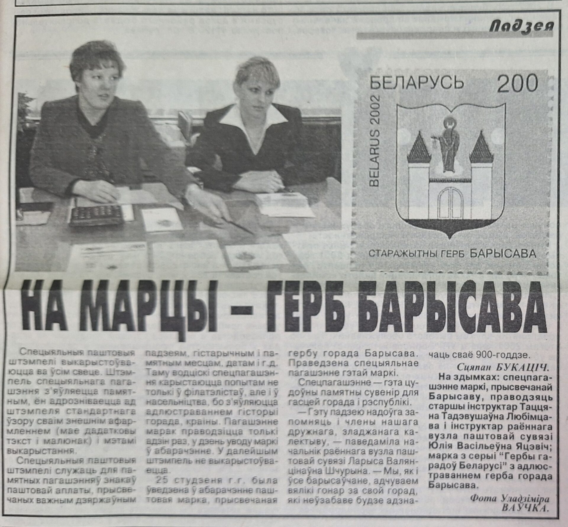 На первой полосе газеты от 5 февраля в статье «На марцы — герб Барысава» рассказывается, что «25 студзеня г.г. была ўведзена ў абарачэнне паштовая марка, прысвечаная гербу горада Барысава. Праведзена спецыяльнае пагашэнне гэтай маркі».