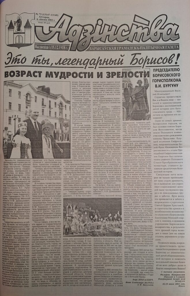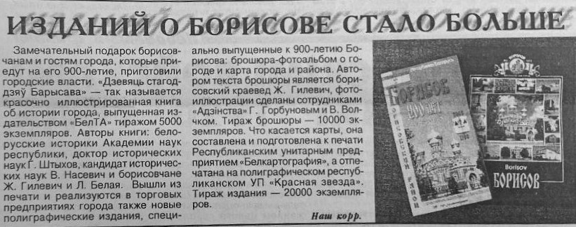 «Замечательный подарок борисовчанам и гостям города, которые приедут на его 900-летие, приготовили городские власти. «Дзевяць стагоддзяў Барысава» — так называется красочно иллюстрированная книга об истории города», — сообщается в этом же номере газеты. А еще — о выпуске брошюры-фотоальбома о городе и карты города и района. Автор текста брошюры — борисовский краевед Ж. Гилевич, а фотоиллюстрации для нее сделаны сотрудниками «Адзінства».