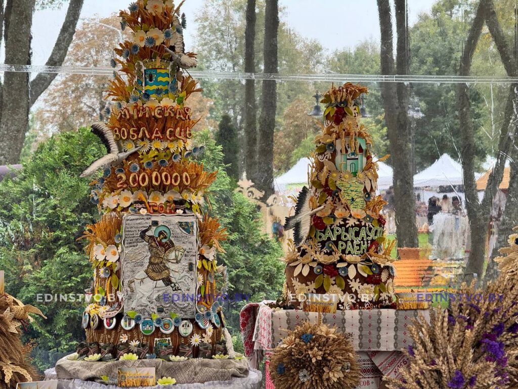 Вес каравая Борисовщины составил 40 кг. Наряду с колосками его украшают аисты – символ Беларуси.