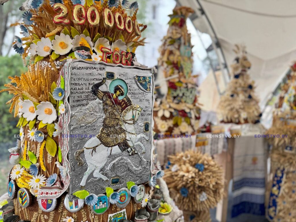 – В этом году уборочная проходила в достаточно сложных погодных условиях, но Минщина победила непогоду, собрав высокий урожай, отсюда и концепция, – объяснил идею размещения образа Георгия Победоносца в центре композиции.