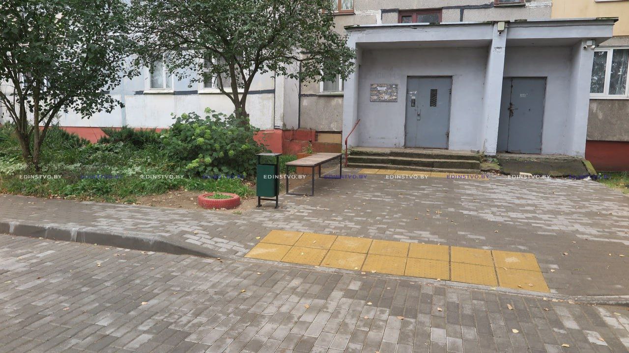 Работа по благоустройству двора проведена большая. Здесь уложена тротуарная плитка не только на пешеходных дорожках вдоль дома и возле подъездов, но и на проезжей части и автостоянке. Установлены новые малые архитектурные формы: скамейки и урны.