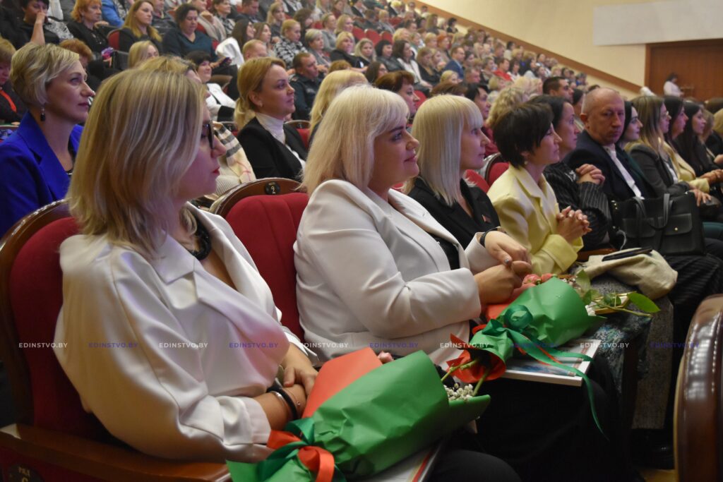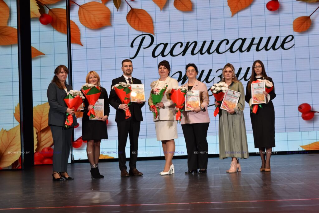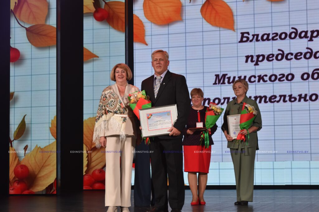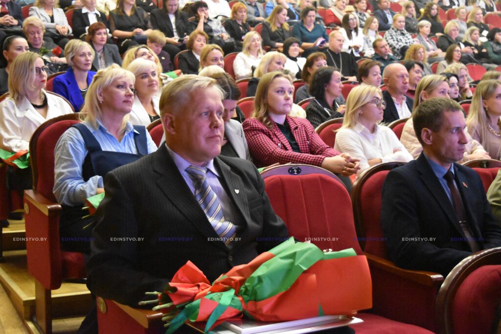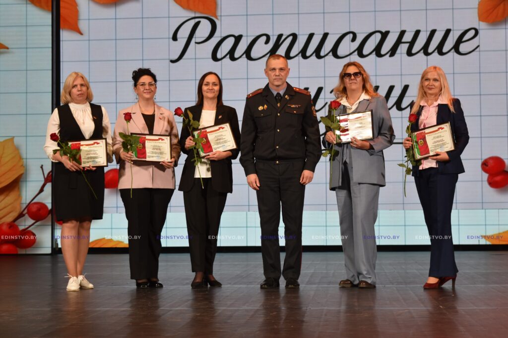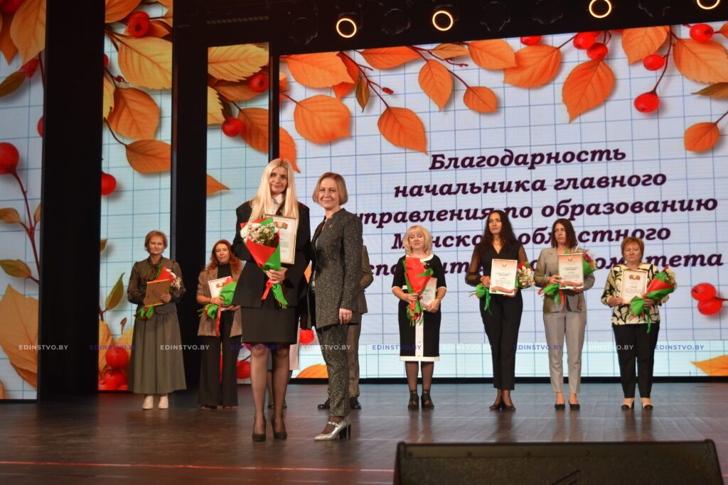 На сцене Лилия Эдуардовна вручила нагрудный знак Министерства образования Республики Беларусь «Отличник образования» за высокий профессионализм, многолетнюю добросовестную работу, плодотворную управленческую деятельность по развитию системы образования Борисовского района, координацию работы с одаренными и высокомотивированными учениками в учреждениях образования Борисовского района на высоком организационно-содержательном уровне бы вручен начальнику отдела дошкольного и общего среднего образования управления по образованию Борисовского райисполкома Светлане Снежко.