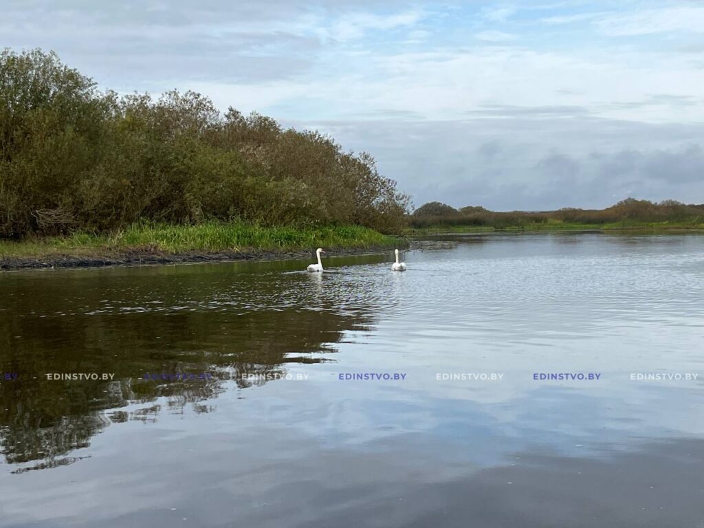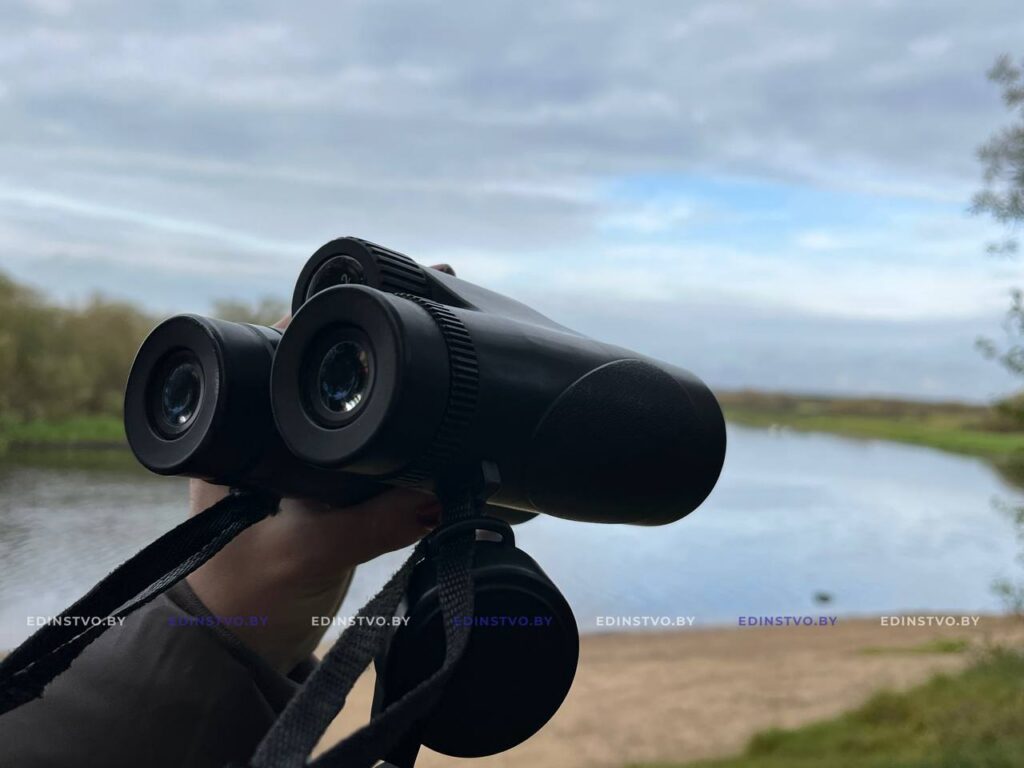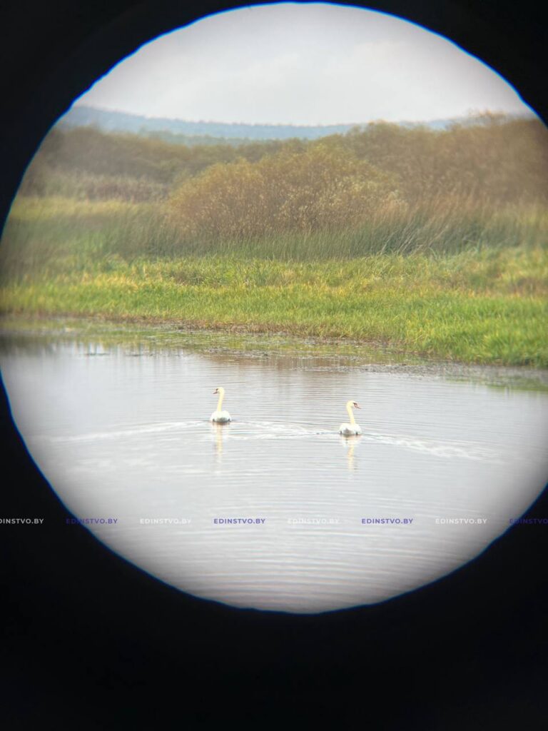 Участники прогулки получили бинокли для наблюдения за птицами и уже через несколько минут смогли применить их на практике: прямо на одном из участков реки Березины, плавно петляющей вдоль этих мест, внимание группы привлекла пара грациозных лебедей-шипунов.