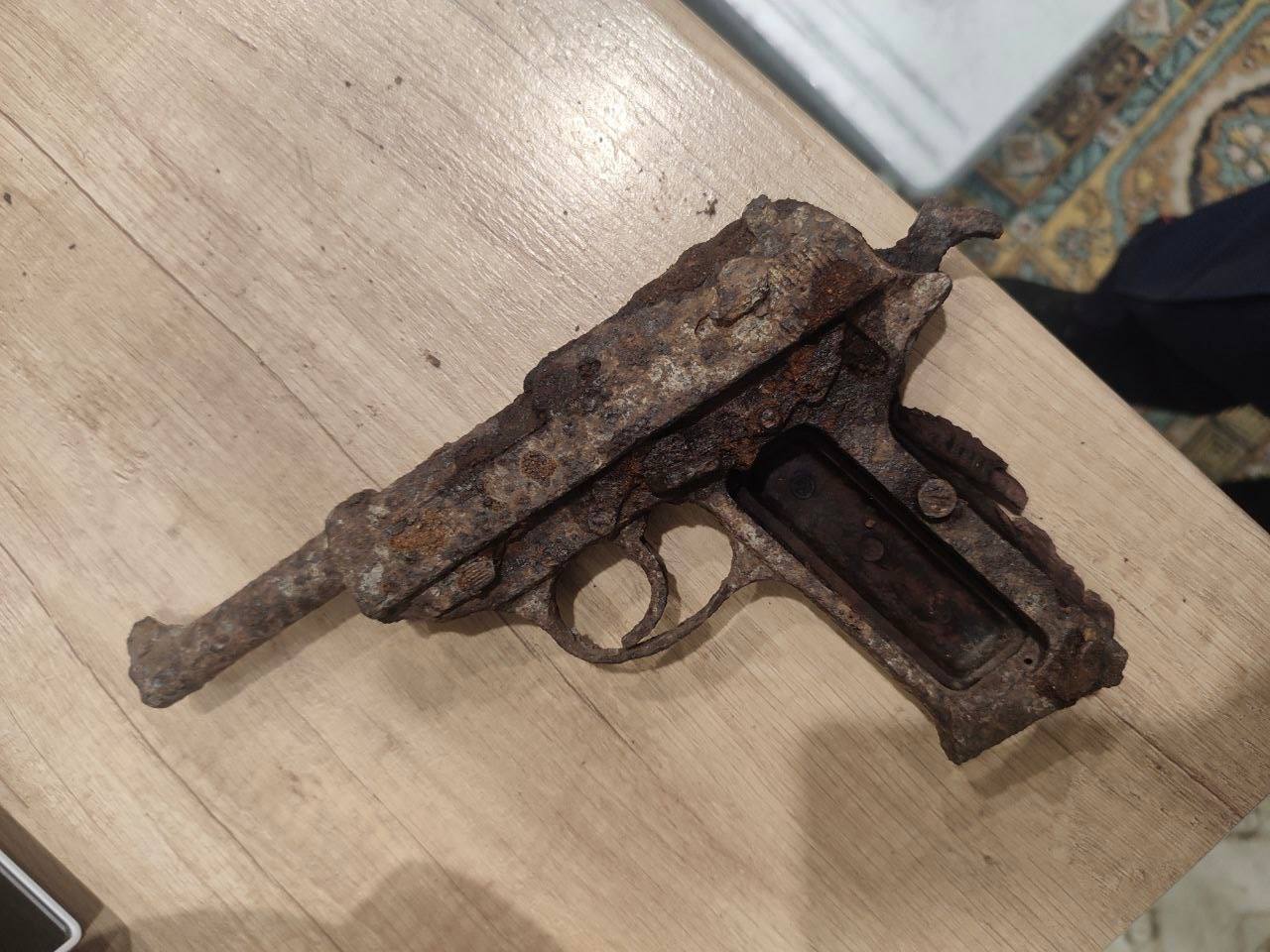 На территории частного подворья в деревне Перстень Борисовского района в земле около входа в дом был обнаружен иностранный пистолет, предположительно Walther, со следами сильной коррозии.