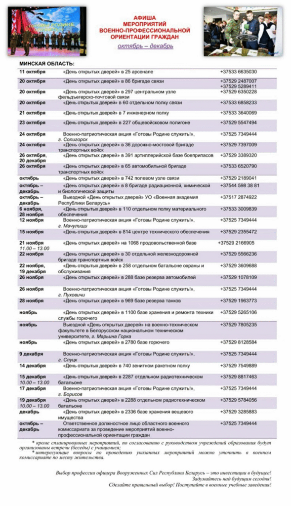 Какие мероприятия по профессиональной ориентации граждан к поступлению в военные учебные заведения проходят на Минщине 11.10.2025 Поделиться FacebookTelegramVK Общество Популярное «Спортивный переполох» снова объединил молодых специалистов Борисовщины Криминальный дуэт: в Борисовском районе отчим с пасынком обворовывали дома соседей 12-13 июля на Кургане Славы продолжится V сезон выставок На площади 900-летия в Борисове продолжается реконструкция 10-й клуб в карьере Александра Павловца О чем говорили с учащимися Борисовского кадетского училища на встрече Заключение брака и развод в Беларуси подорожали Поделиться FacebookTelegramVK - Advertisement - Последние новости От проекта до автобуса: школьники открыли для себя мир машиностроения 12.11.2025 Команда Минской области — призер открытого Кубка Беларуси по мини-футболу среди людей с инвалидностью по слуху 12.11.2025 Обсуждены вопросы формирования стабфондов плодоовощной продукции. В том числе — цены на картофель и его размер 12.11.2025 «ИННОРЕГИОН-2025». Поговорили с первым заместителем председателя Борисовского райисполкома Николаем Швайбовичем о том, в чем особенности инновационного форума в 2025 году 12.11.2025 Александр Шипуло проведет прием граждан. Осуществляется предварительная запись 12.11.2025