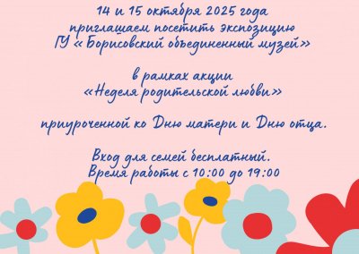 В рамках акции «Неделя родительской любви» 14 и 15 октября 2025 . Государственное учреждение «Борисовский объединенный музей» приглашает посетить экспозицию музея в рамках акции «Неделя родительской любви», приуроченной ко Дню матери и Дню отца.