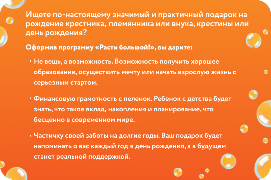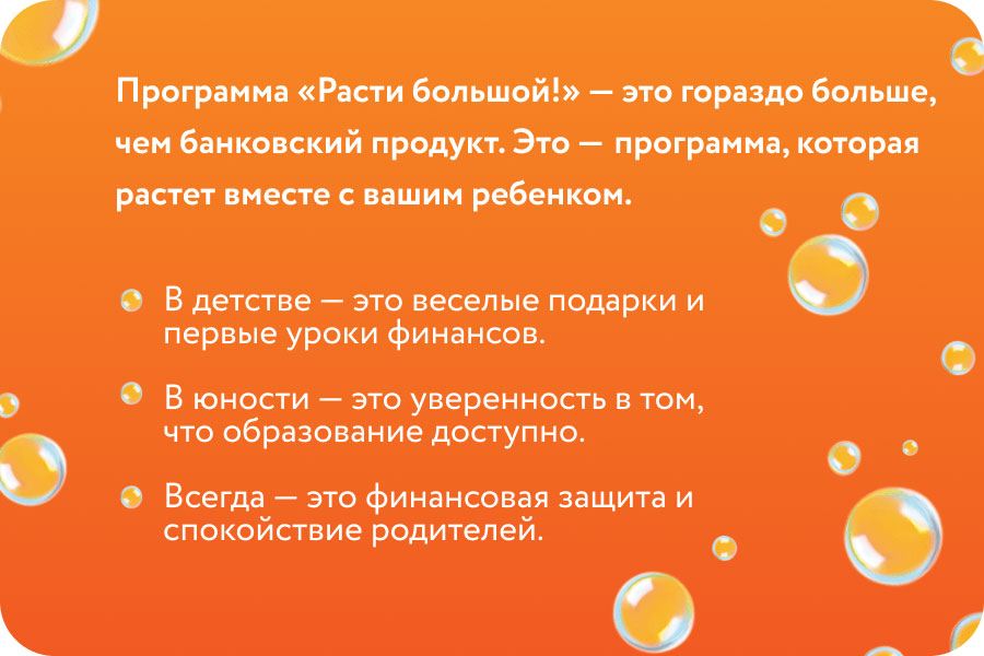 «Расти большой!» — это не просто способ сохранить и приумножить средства. Это комплексная программа и суть ее проста. Родители, родственники или опекуны открывают в банке вклад на имя ребенка. Это действие становится первым и самым важным шагом в формировании его финансовой поддержки. Средства на счете надежно защищены и постепенно растут благодаря начисляемым процентам. Такой подход с ранних лет прививает ребенку культуру финансовой грамотности и демонстрирует на практике, как капитал может работать на перспективу.