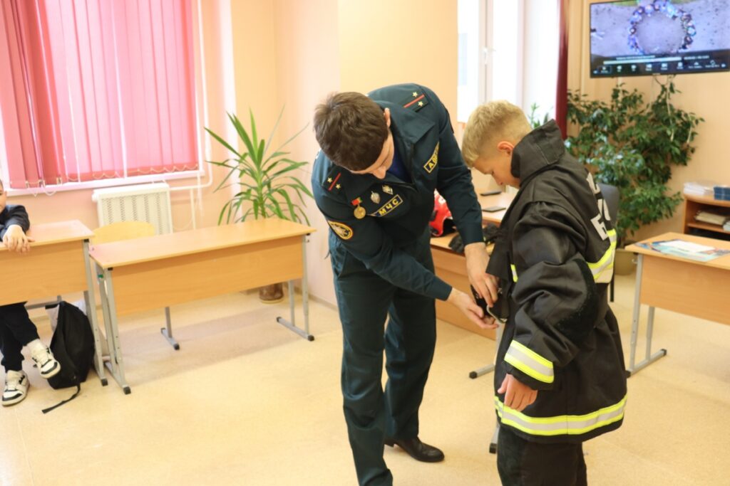 Никита Соловьев рассказал об экипировке спасателей и наглядно показал, как спасатель защищает себя от огня, после ребята примерили боевку огнеборцев.