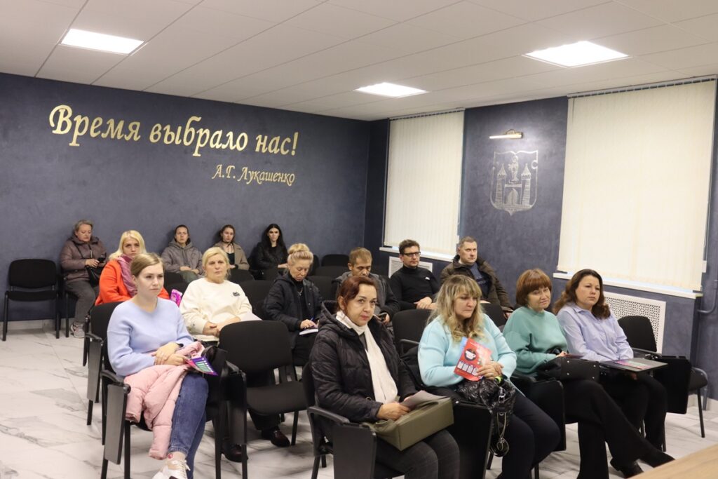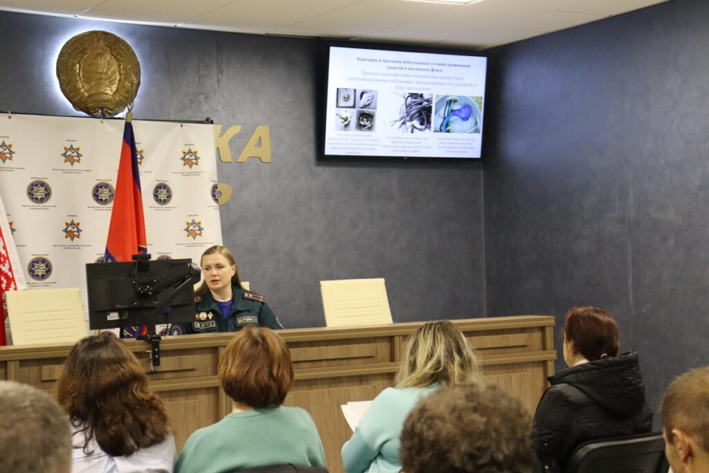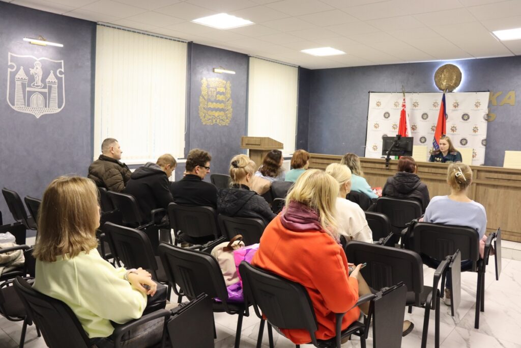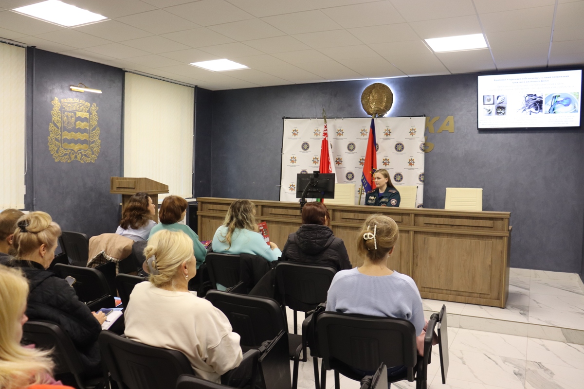 В рамках республиканской акции «За безопасность вместе!» в актовом зале Борисовского горрайотдела по чрезвычайным ситуациям заместитель начальника отдела подполковник внутренней службы Кристина Шкарадёнок провела дополнительное обучение основам безопасности жизнедеятельности, мерам по предупреждению пожаров и других чрезвычайных ситуаций, действиям при их возникновении для работников служб жилищно-коммунального хозяйства, работников, оказывающих социальную и медицинскую помощь на дому пожилым гражданам, инвалидам, семьям, воспитывающим детей.