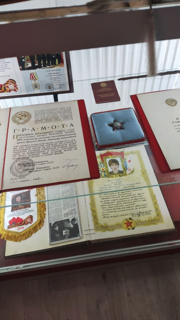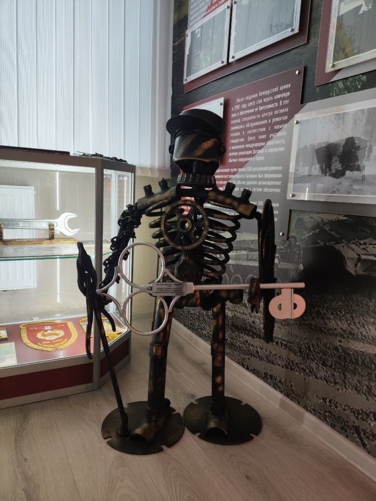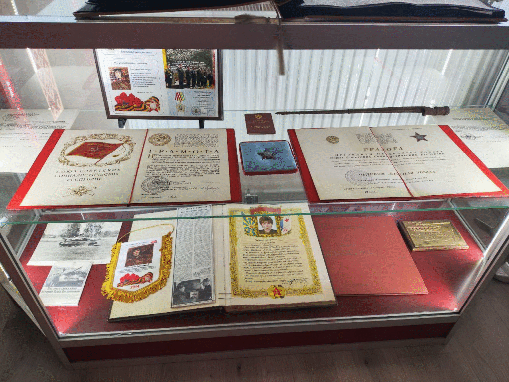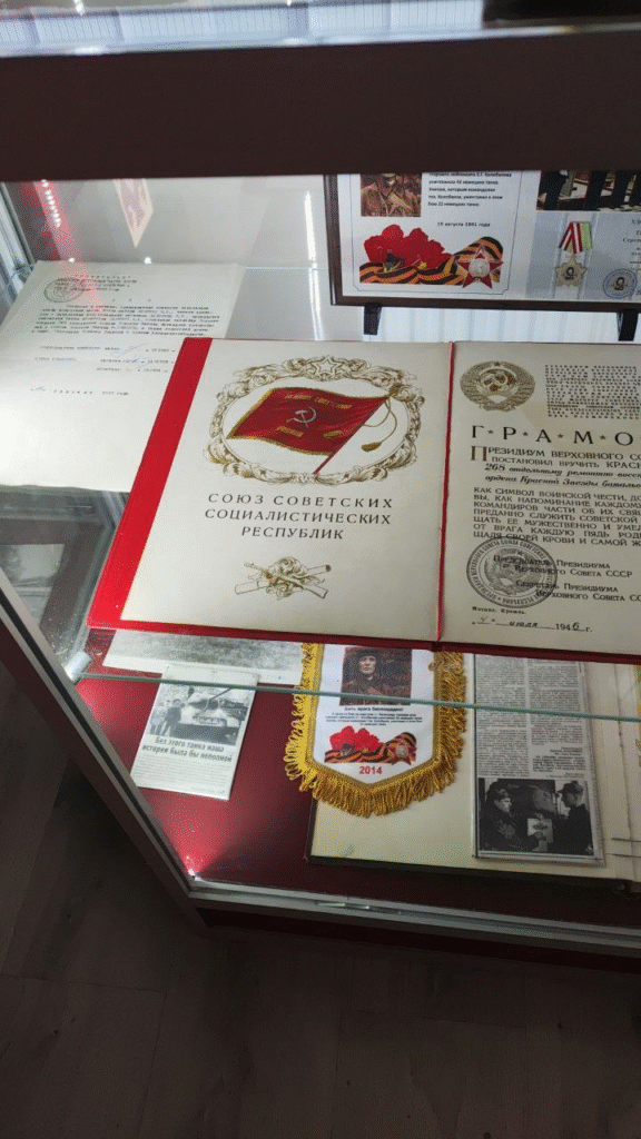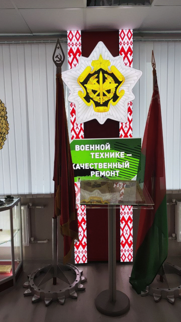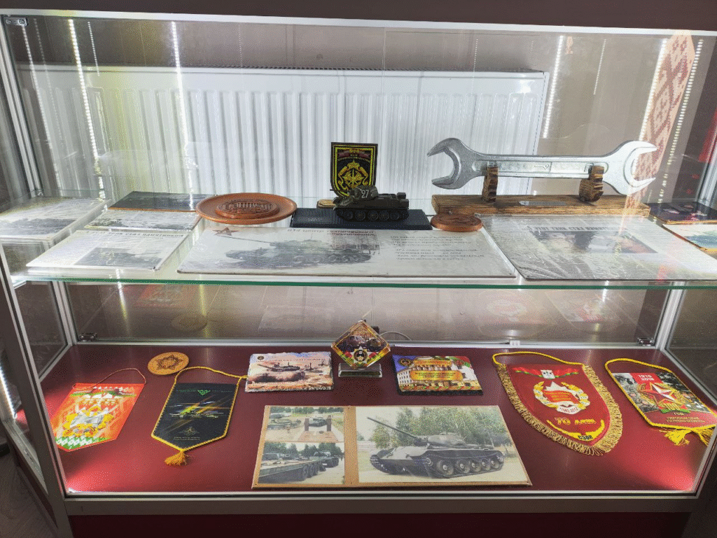 — Воинская часть является орденоносной, была награждена Орденом Красной Звезды в Великую Отечественную войну, что подчеркивает роль ремонтников в Победе. Она одна из немногих частей, которая награждена таким Орденом в нашей стране. Здесь же имеется и Боевое знамя, которое было вручено в 1944 году нашей воинской части. Здесь же представлены фото времен Великой Отечественной войны, сам Орден и фотоальбом от 14 ноября 1980 г., его мы очень ценим, в нем отражено, как был организован ремонт техники в те года. Мы используем комнату для поднятия патриотического духа, принимаем здесь присягу военнослужащих контрактной службы и проводим разного рода мероприятия, — поделился Дмитрий Иванович.