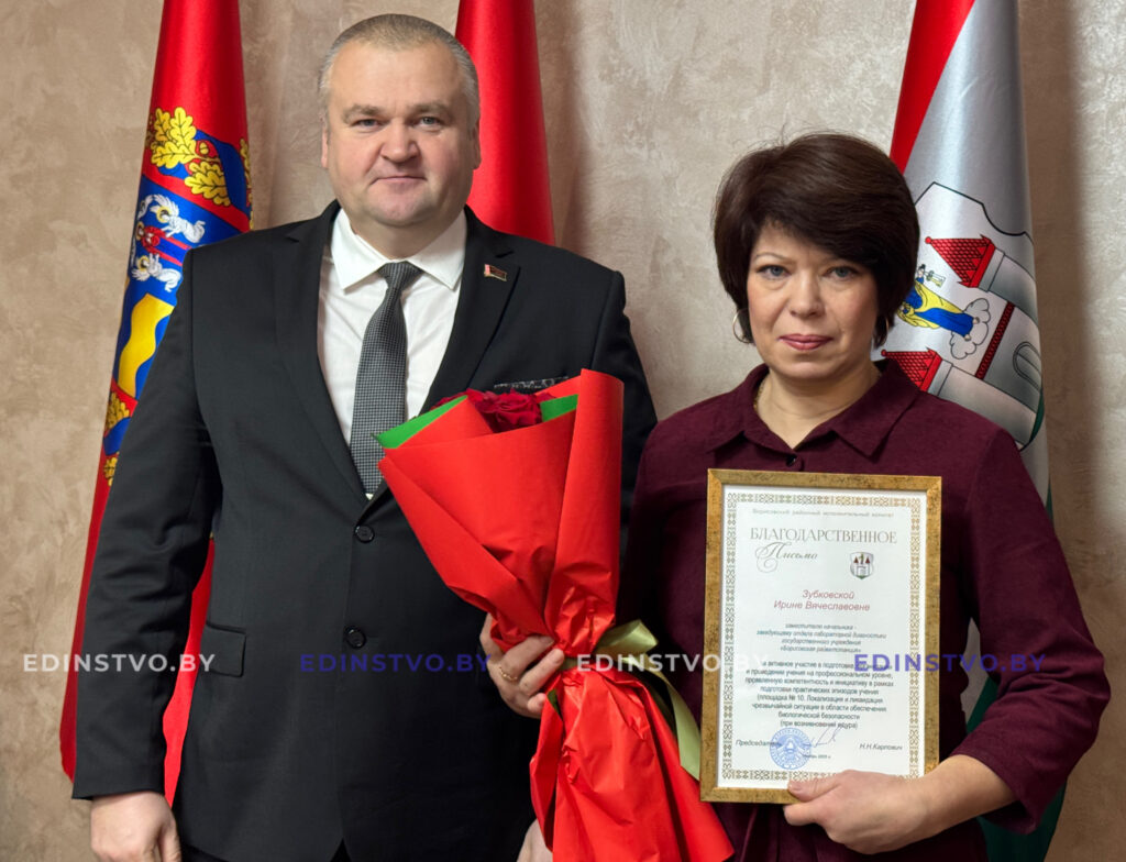 Ряд работников ГУ «Борисовская райветстанция» получили Благодарности и Благодарственные письма председателя Борисовского райисполкома за активное участие в подготовке, организации проведении учения на профессиональном уровне, проявленную компетентность и инициативу в рамках подготовки практических эпизодов учения по локализации и ликвидации чрезвычайной ситуации в области обеспечения биологической безопасности.