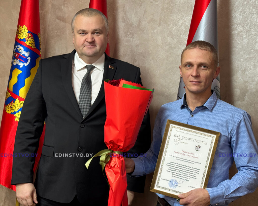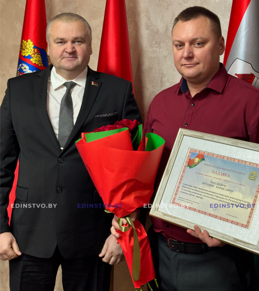 За мужество, решимость, и умелые действия, проявленные при спасении людей во время пожара Благодарность председателя Минского областного исполнительного комитета объявляется подполковнику Евгению Маслиевичу, командиру кадра понтонно-мостового батальона инженерного полка Северо-западного оперативного командования Вооруженных Сил Республики Беларусь и заместителю начальника по содержанию филиала коммунального унитарного предприятия «Минскоблдорстрой»-«ДРСУ №122» Владимиру Сухоницкому (на главном фото).