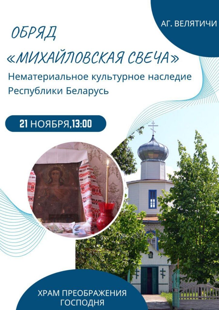 Ежегодно 21 ноября, в день празднования Собора архистратига Михаила и прочих Небесных сил бесплотных, жители аг. Велятичи Борисовского района переносят свечу и икону святого Архистратига Михаила из одного дома в другой. По давней местной традиции «свечой» называли обряд перенесения (передачи) одной из двенадцати старинных икон первой половины ХХ века, сохраненной местными жителями после разрушения велятичской Спасо-Преображенской церкви в 30-х годах ХХ столетия. В деревне, разделенной на двенадцать поселков, до нашего времени сохранились лишь две иконы: Михайловская и Юрьевская. Юрьевская икона с 1991 г. не переносится.
