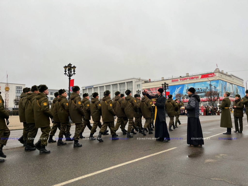 Под звуки оркестра личный состав воинских подразделений торжественным маршем прошел по центральной площади, настоятель храма Рождества Христова протоиерей Евгений освятил и благословил солдат на несение воинской службы.