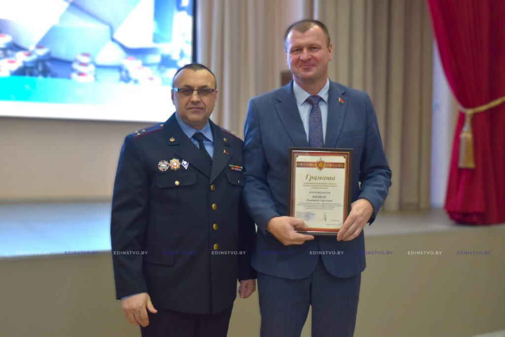 В продолжение мероприятия он торжественно наградил Грамотой за активное участие и эффективное содействие управлению Государственного комитета судебных экспертиз по Минской области в решении возложенных на него задач награжден директора Борисовского кадетского училища Минской области Дмитрия Болбаса.