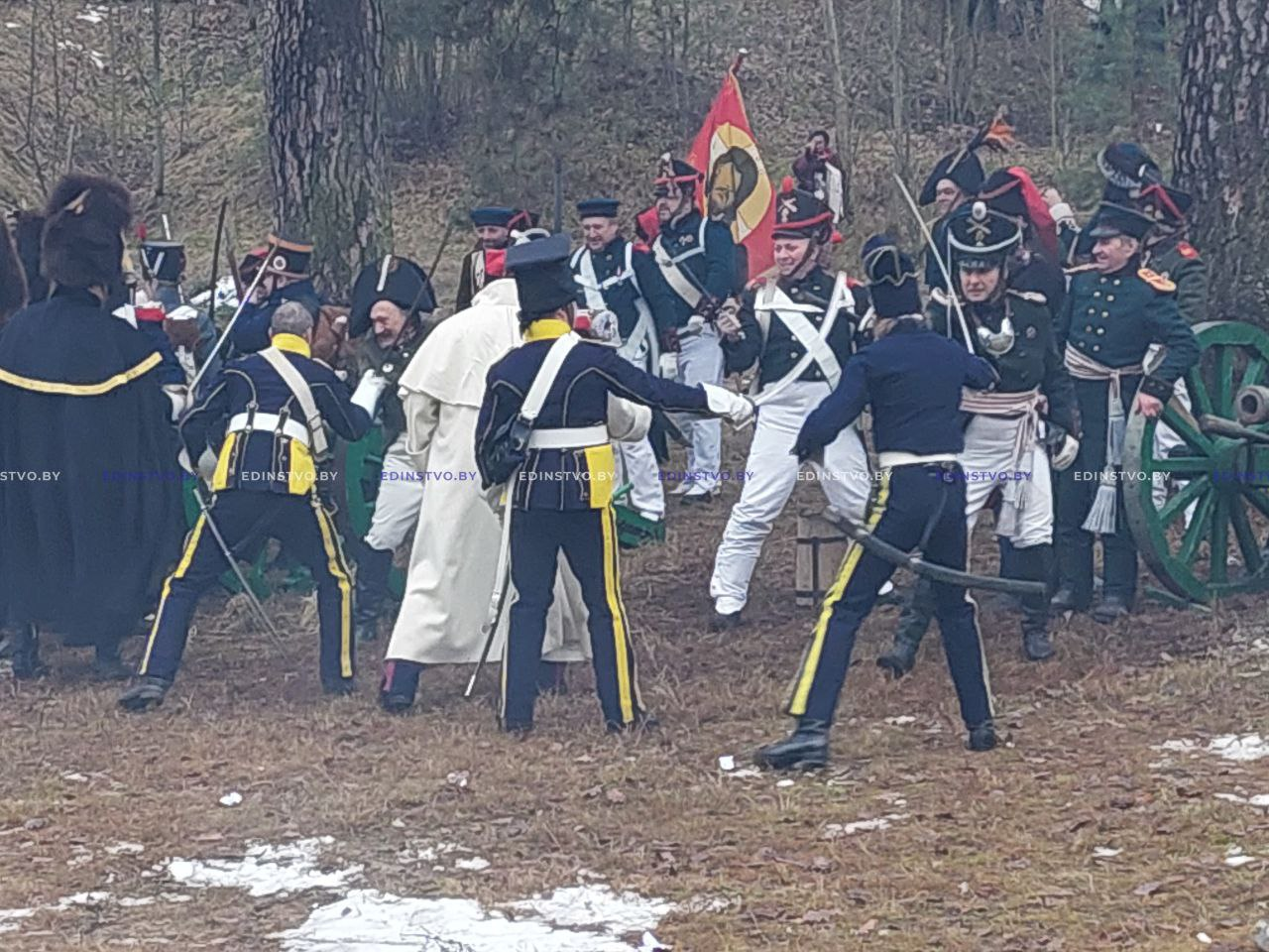 Наполеоновскими войсками в сегодняшней реконструкции командовал Дмитрий Раков, представляющий исторический клуб из Минска «Фузелеры-гренадеры Императорской Гвардии».