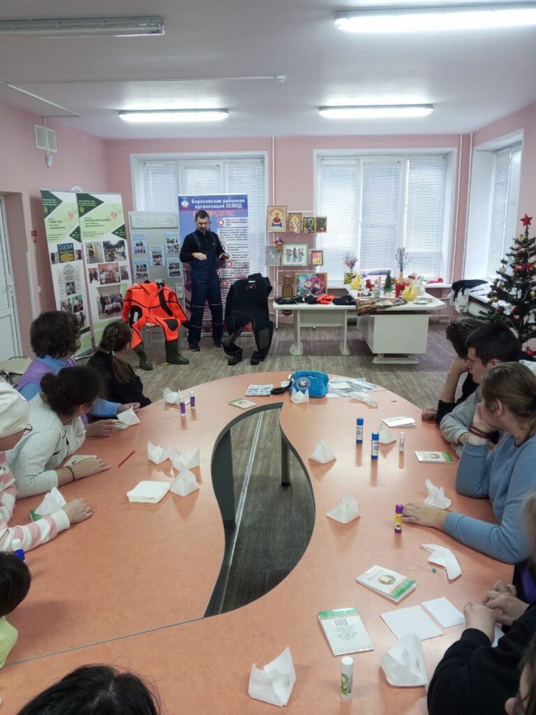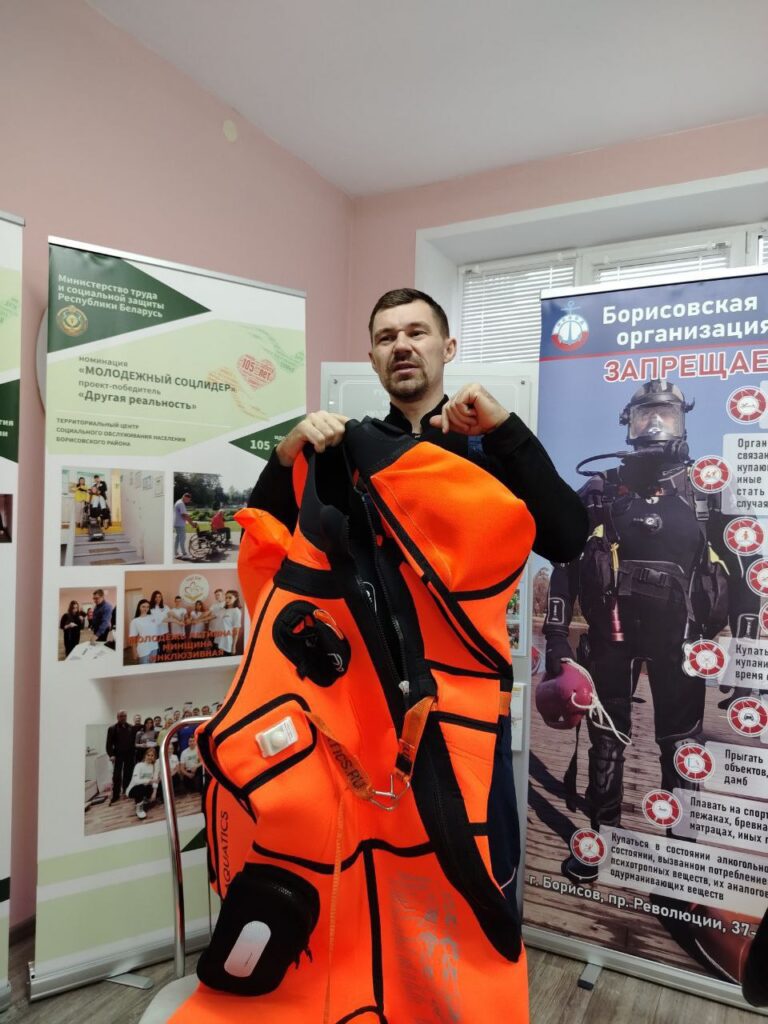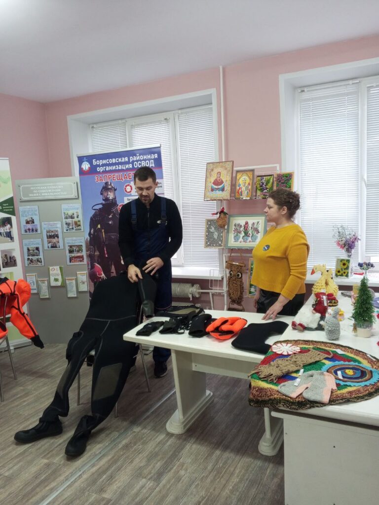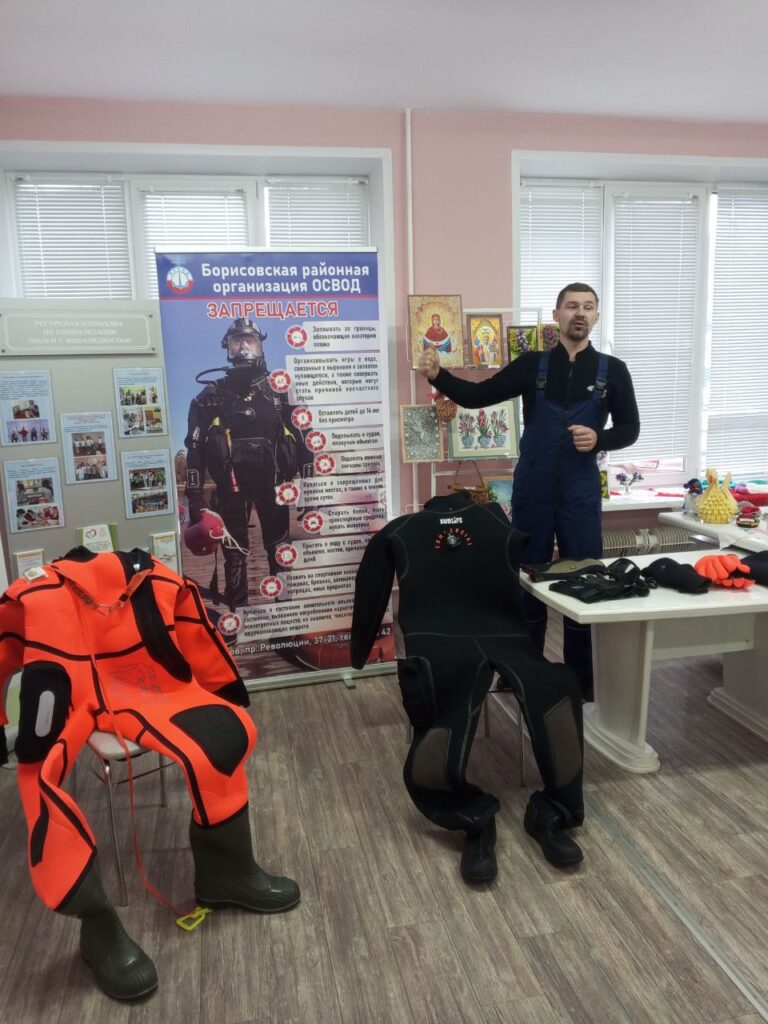 Надежда Великохатько вместе со специалистом по социальной работе, председателем первичной организации «ОСВОД» учреждения Светланой Сытик провели тематическую беседу о правилах безопасности на водоемах. Ребята повторили основные правила безопасного поведения на водоемах, обсудили, как действовать в чрезвычайной ситуации и сохранить себе жизнь. Начальник Борисовской спасательной станции Евгений Михнюк рассказал о своей профессиональной деятельности, поделился яркими примерами из своей практики, рассказал о сложной и ответственной работе водолазов и матросов-спасателей. Также Евгений продемонстрировал ребятам спасательное и водолазное оборудование, объяснил его назначение и принципы работы.