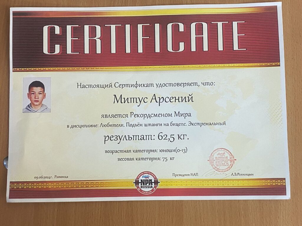 Знакомьтесь, Арсений Митус. В колледже он прилежный учащийся, а за его пределами — обладатель сертификата Рекордсмена мира в дисциплине «Любители. Подъем штанги на бицепс». Его результат — 62,5 кг (в категории юноши до 13 лет, вес до 75 кг).