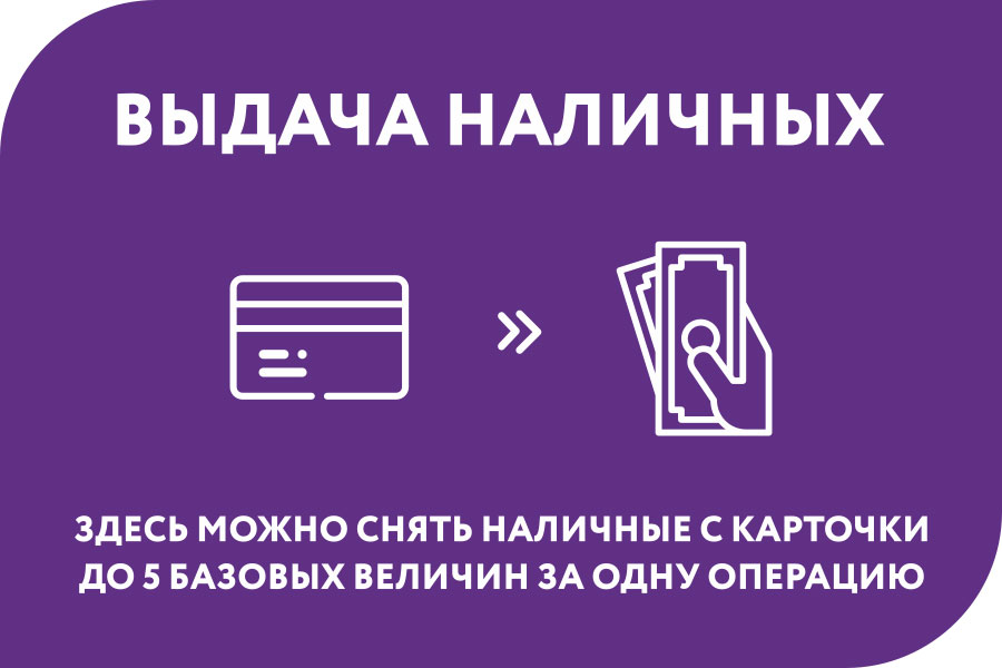 В чем полезность? Не все ситуации позволяют рассчитаться картой, а банкомата может не оказаться поблизости. Там, где на кассе есть специальная фиолетовая наклейка, вы можете снять небольшую сумму – от 10 до 210 (5 базовых величин) белорусских рублей – прямо через платежный терминал.