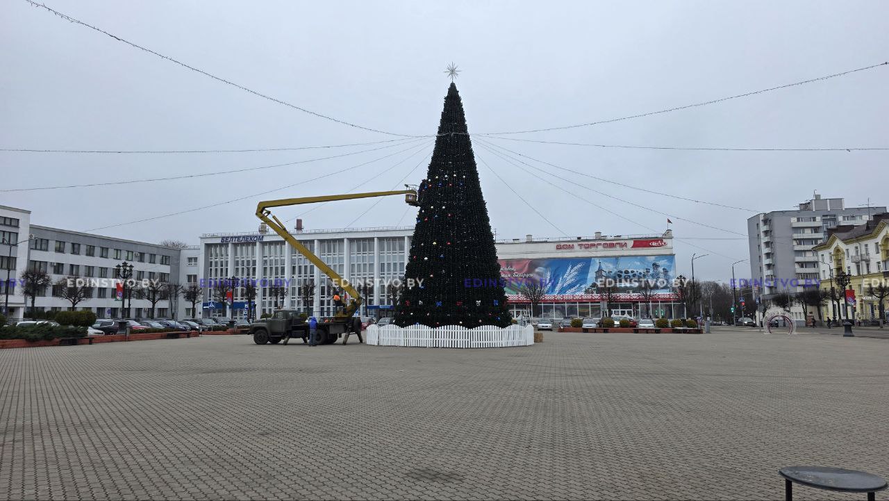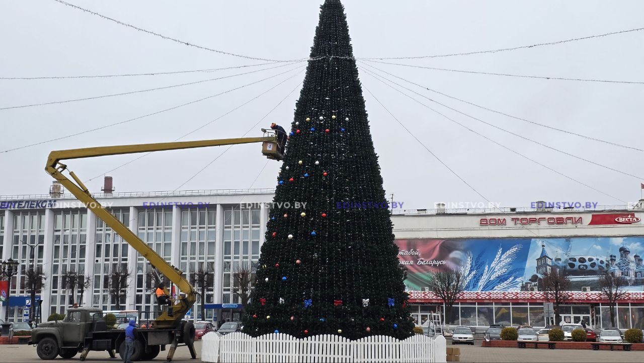 Новогодняя красавица на центральной площади города недавно зажглась новой иллюминацией, а сегодня ее начали украшать игрушками.