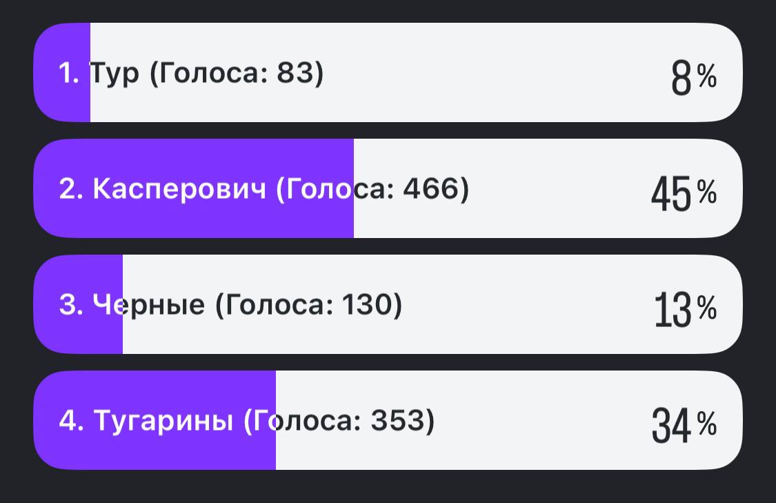 На втором месте по итогам голосования расположились Дарья и Александр Тугарины. За них проголосовали 353 человека (34%).