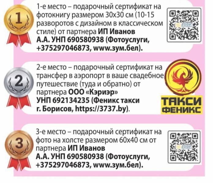 Пары получат призы от от редакции газеты «Адзiнства» и партнеров ИП Иванов А.А. УНП 690580938 (Фотоуслуги, +375297046873, www.зум.бел) и ООО «Кэриэр» УНП 692134235 (Феникс такси, г. Борисов, https://3737.by). Корреспондент в ближайшее время свяжется с победителями и призерами, чтобы уточнить некоторые детали и рассказать, как забрать призы в редакции (г. Борисов, ул. Строителей, 33а) до 31 декабря. Не забудьте взять с собой паспорта. И будьте готовы к фото: с радостью запечатлим еще один приятный момент вашей семейной жизни.