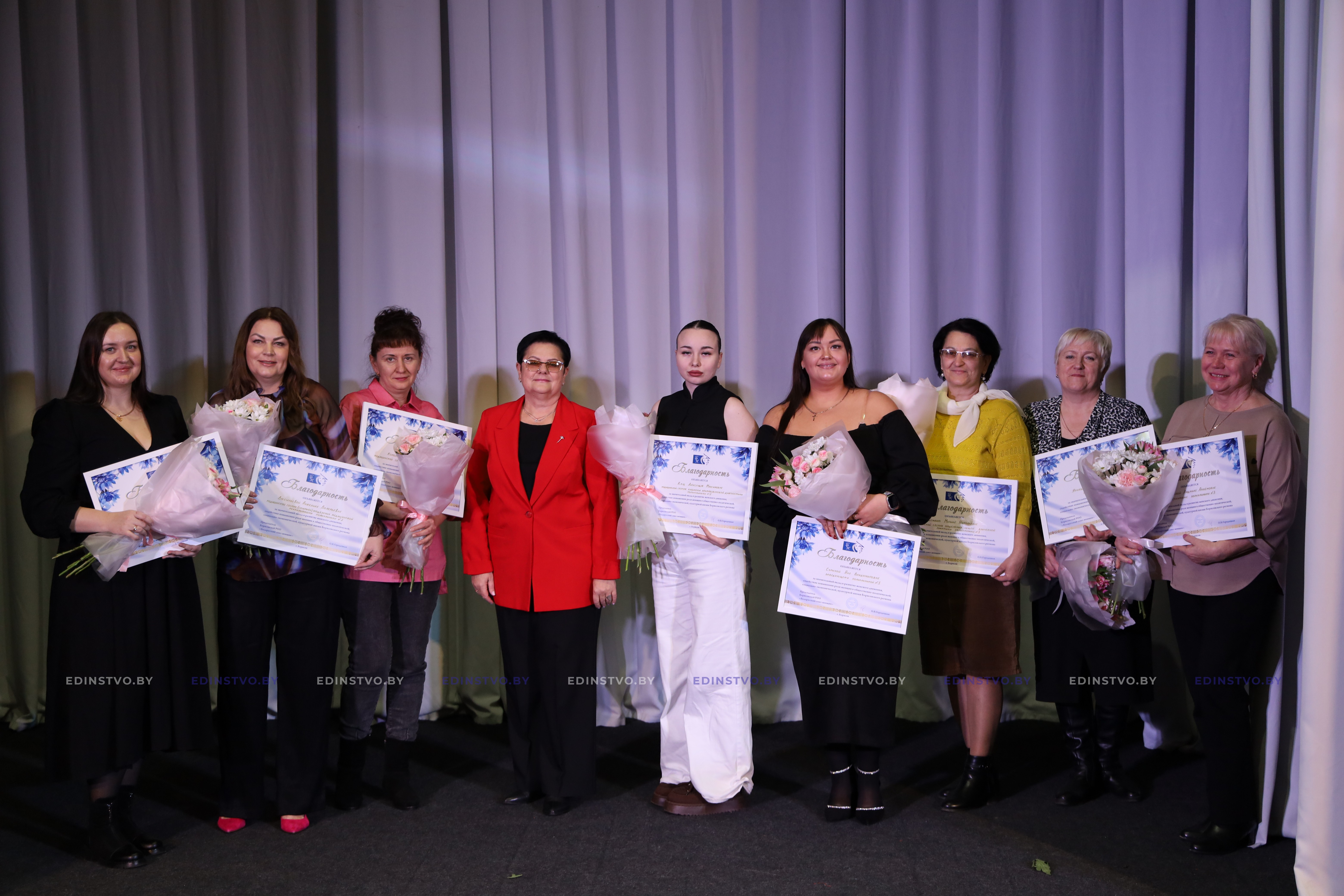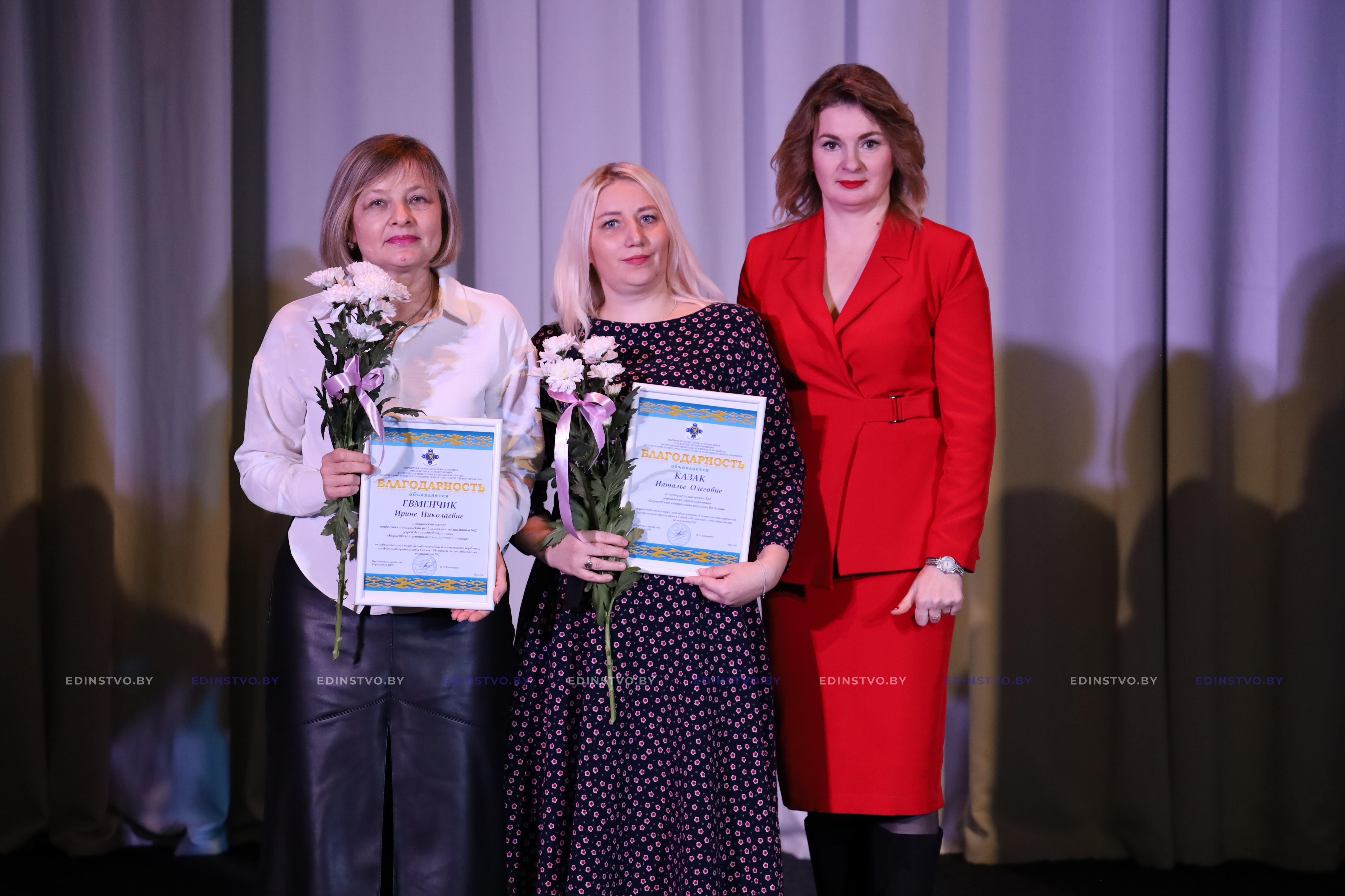 Благодарность Борисовской районной организации общественного объединения «Белорусский союз женщин» была объявлена врачу общей практики (заведующему) поликлиникой №2 Инне Слычко, медицинской сестре (старшей) отделения поликлиники №2 Анжелике Васильевой, медицинской сестре отделения медицинской реабилитации поликлиники №2 Ирине Короленок, медицинской сестре кабинета ультразвуковой диагностики поликлиники №2 Александре Кущ, врачу общей практики (заведующему) поликлиникой №3 Яне Суриной, медицинской сестре отделения общей врачебной практики поликлиники №3 Марине Жигмант, санитарке поликлиники №3 Ирине Прибыльской, санитарке поликлиники №3 Людмиле Куликовой.